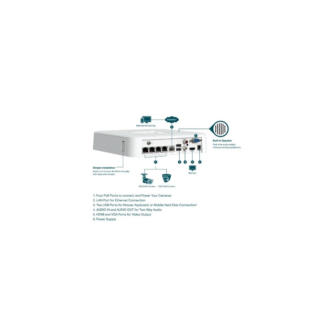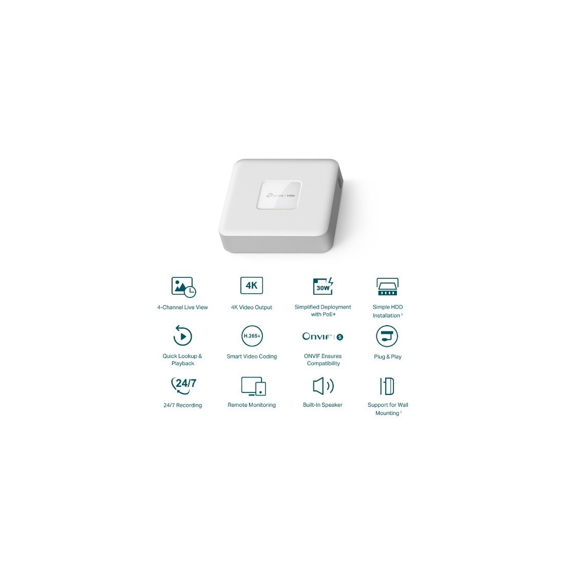 Grabador NVR para cámaras IP 4 CH vídeo PoE 802.3af/at Resolución máx 8 Mpx / Compresión H.265+ Ancho de banda 80 Mbps Salida HDMI 4K y VGA Admite 1 disco duro hasta 10TB Búsqueda y Reproducción Rápidas. encuentra grabaciones fácilmente por fecha, tipos de eventos y etiquetas. Reproduce con velocidades de reproducción variables para revisar rápidamente el metraje