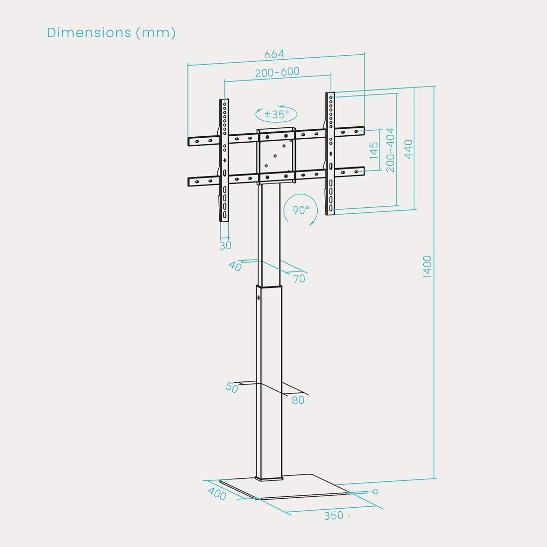 Soporte TV suelo TooQ FS2286M-B Soporte de suelo para pantallas Compatible con 37" a 70" Compatibilidad VESA 200x200 a 600x400 mm Interfaces VESA: 200x200, 300x200, 300x300, 400x200, 400x300, 400x400, 600x400 Carga máxima 40 kg Rotación VESA 0° a 90° (vertical/horizontal) Giro +35°/-35° Sistema de gestión de cables Referencia fabricante: FS2286M-B Color negro