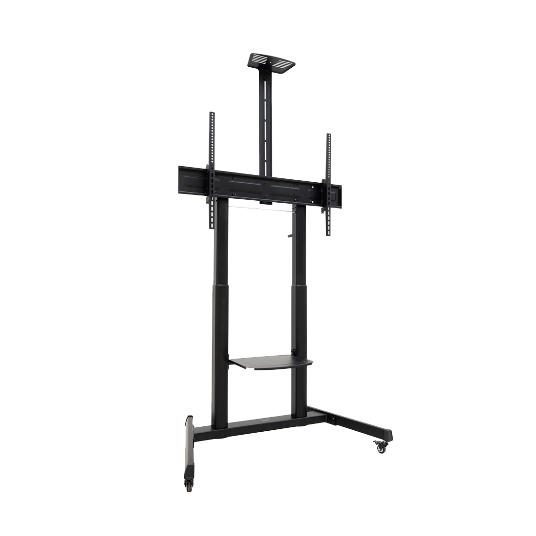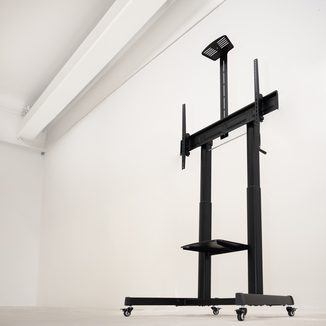 Permite instalar pantallas de gran formato con movilidad, ajuste de altura preciso y accesorios integrados para entornos profesionales.