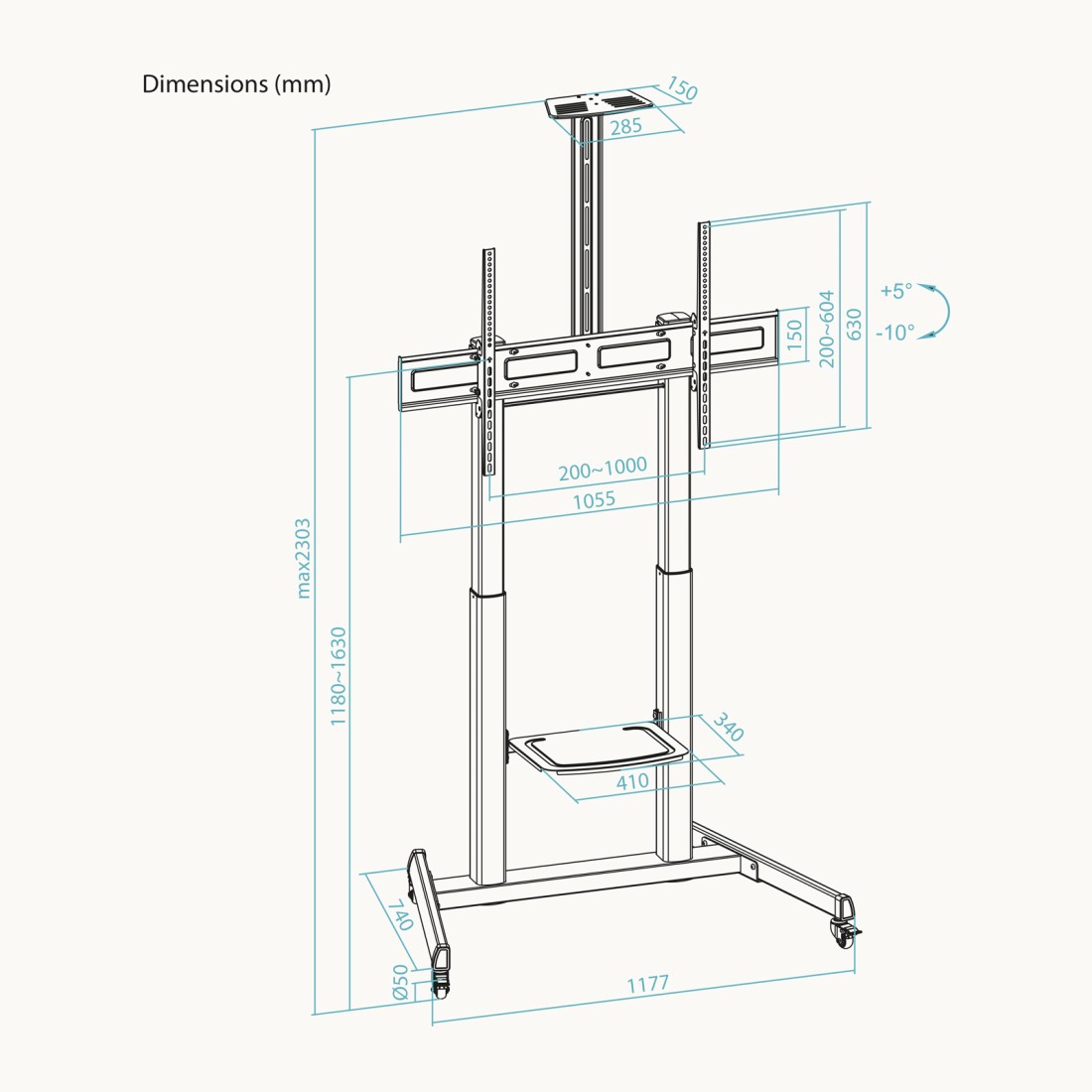 Soporte TV suelo con ruedas TooQ FS20406HM-B Soporte de suelo con ruedas para pantallas Compatible con 60" a 100" Compatibilidad VESA 200x200, 300x200, 300x300, 400x300, 400x400, 600x400, 800x400, 800x600, 900x600, 1000x600 Carga máxima 120 kg Ajuste de altura 1180 a 1630 mm mediante manivela Inclinación +5°/-10° Ruedas con bloqueo y bandejas para accesorios Referencia fabricante: FS20406HM-B color negro