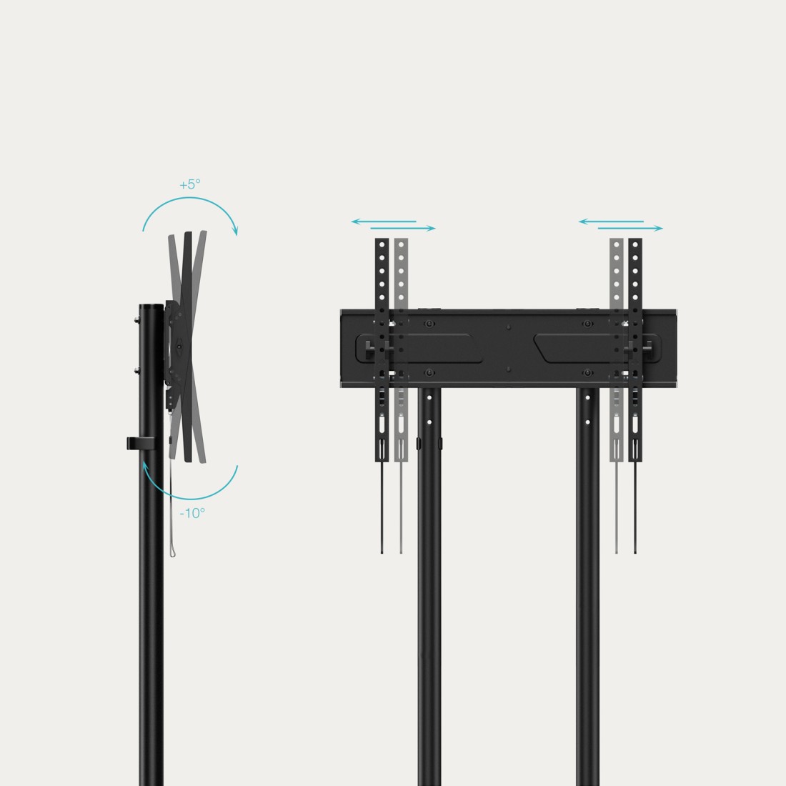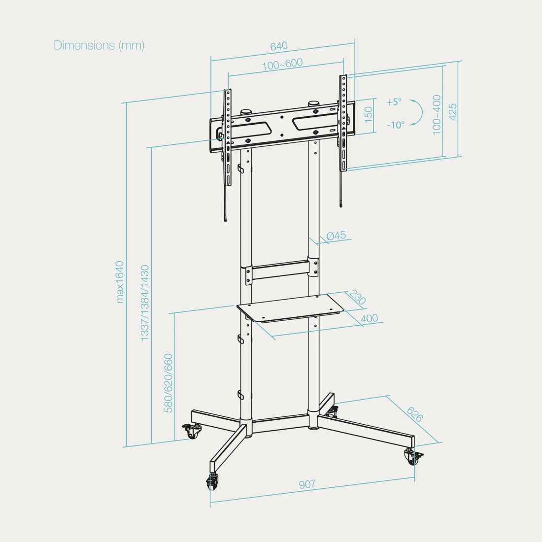 Soporte TV suelo con ruedas TooQ FS1150M-B Soporte de suelo móvil para pantallas Compatible con 37" a 70" Compatibilidad VESA 100x100 a 600x400 mm Interfaces VESA: 100x100, 200x200, 300x200, 300x300, 400x300, 400x400, 600x400 Carga máxima 70 kg Ajuste de altura en 3 posiciones: 1337, 1384 y 1430 mm Inclinación +5°/-10° Ruedas con bloqueo y bandeja para accesorios Referencia fabricante: FS1150M-B color negro