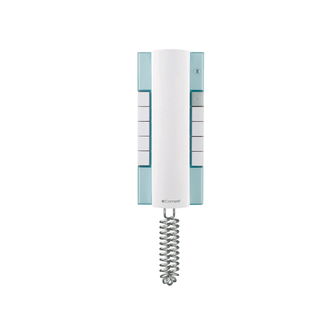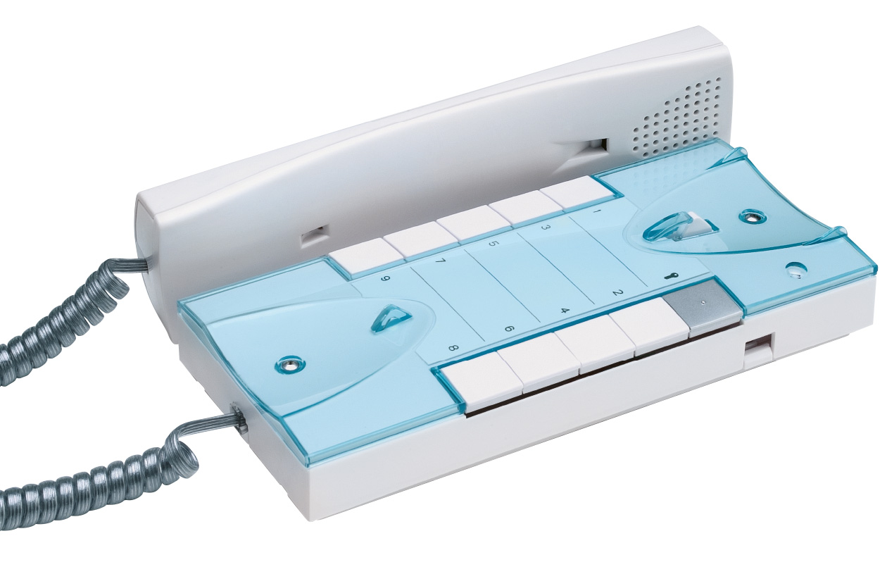 Telefonillo con llamada electrónica, tecla de conversación en la base, regulación del volumen de llamada, privacidad y secreto de conversación. Se suministra de serie con pulsador abrepuertas y otros ocho pulsadores preparados para la función intercomunicante u otros usos (dos pueden liberarse para emplearse como contacto normalmente abierto).