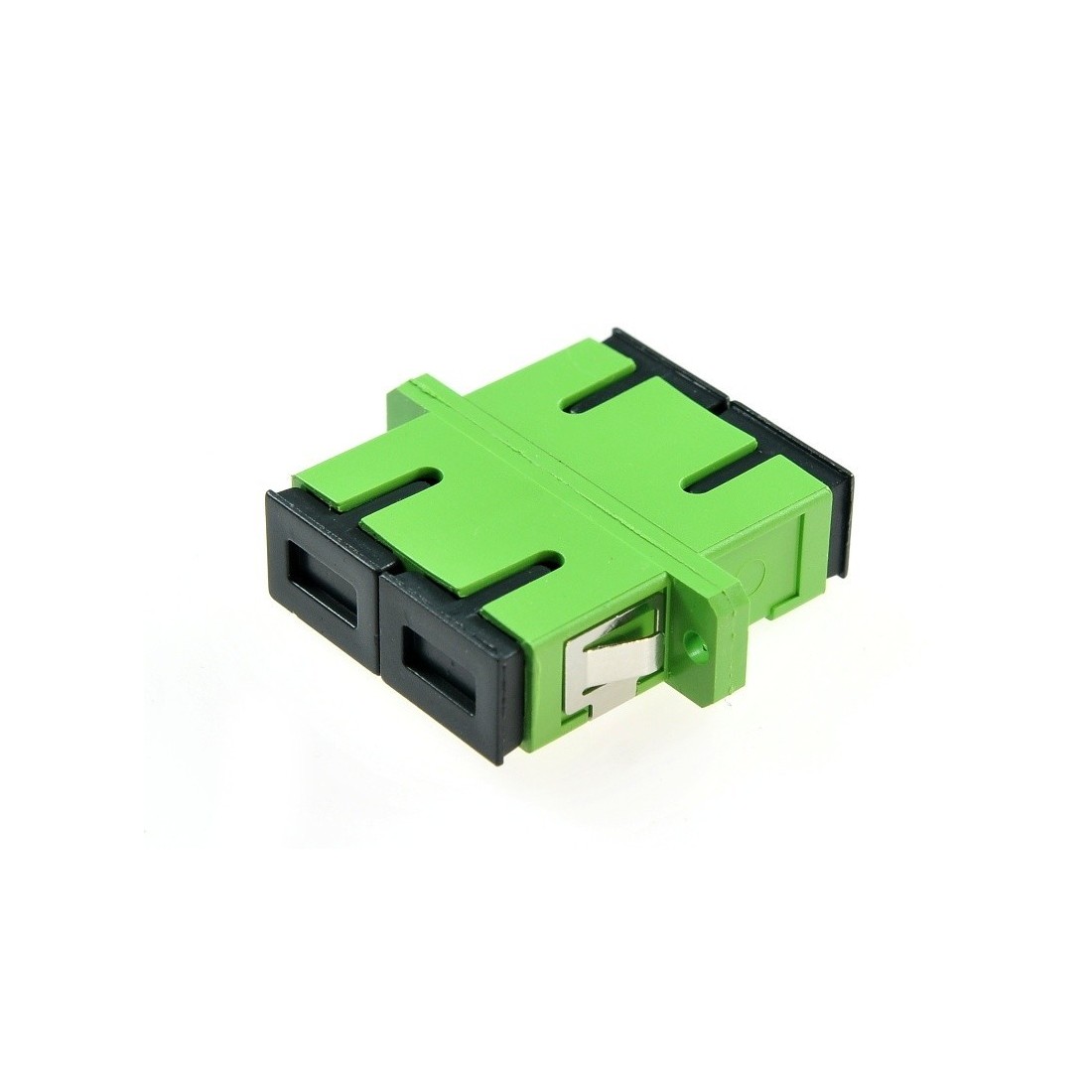 Adaptador LC-LC APC SM, Simplex, Tapón blanco. Sin pestañas. Fijación sin asas. Color verde.