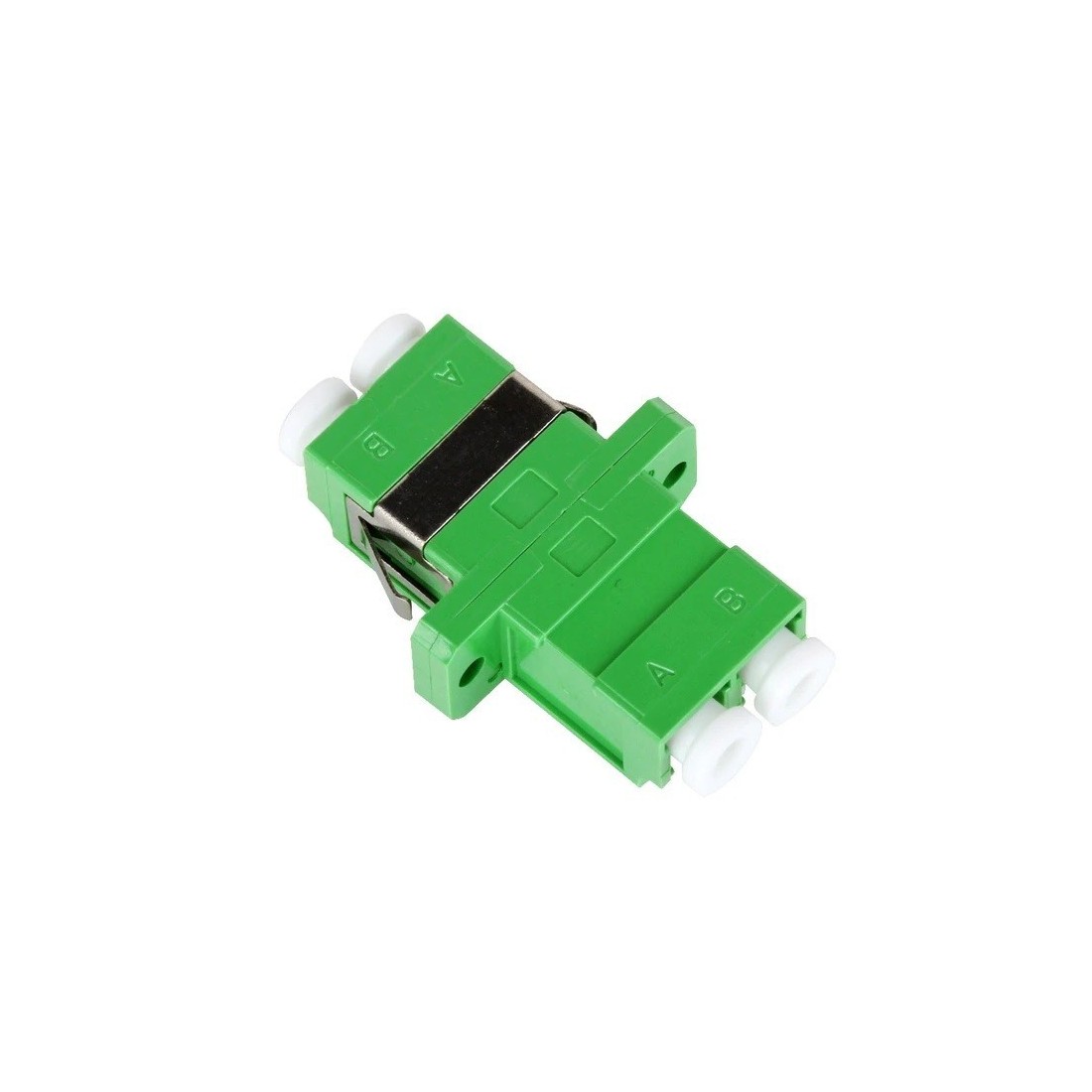 Adaptador LC/APC SM Dúplex, Duplex, Tapón blanco. Bloqueo mediante 3 pestañas.. Fijación sin asas. Color verde.
