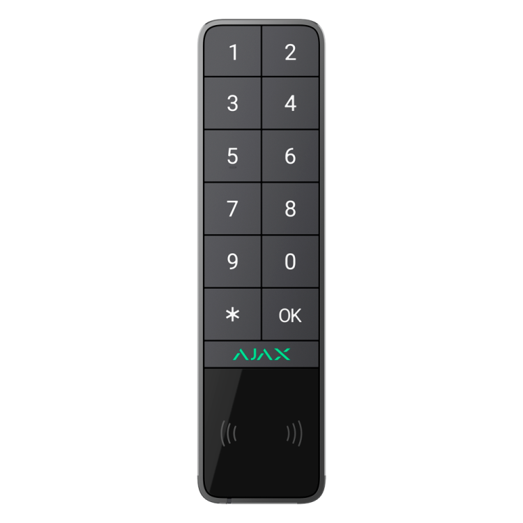 El Teclado inalámbrico Ajax AJ-KEYPADOUTDOOR-GRA es un periférico de control exterior que permite armar, desarmar y gestionar el sistema Ajax mediante códigos, llaveros RFID o smartphones con Bluetooth. Emplea el protocolo bidireccional Jeweller 868 MHz para garantizar una comunicación segura y estable con los paneles centrales Hub 2, Hub 2 Plus y Hub Hybrid.