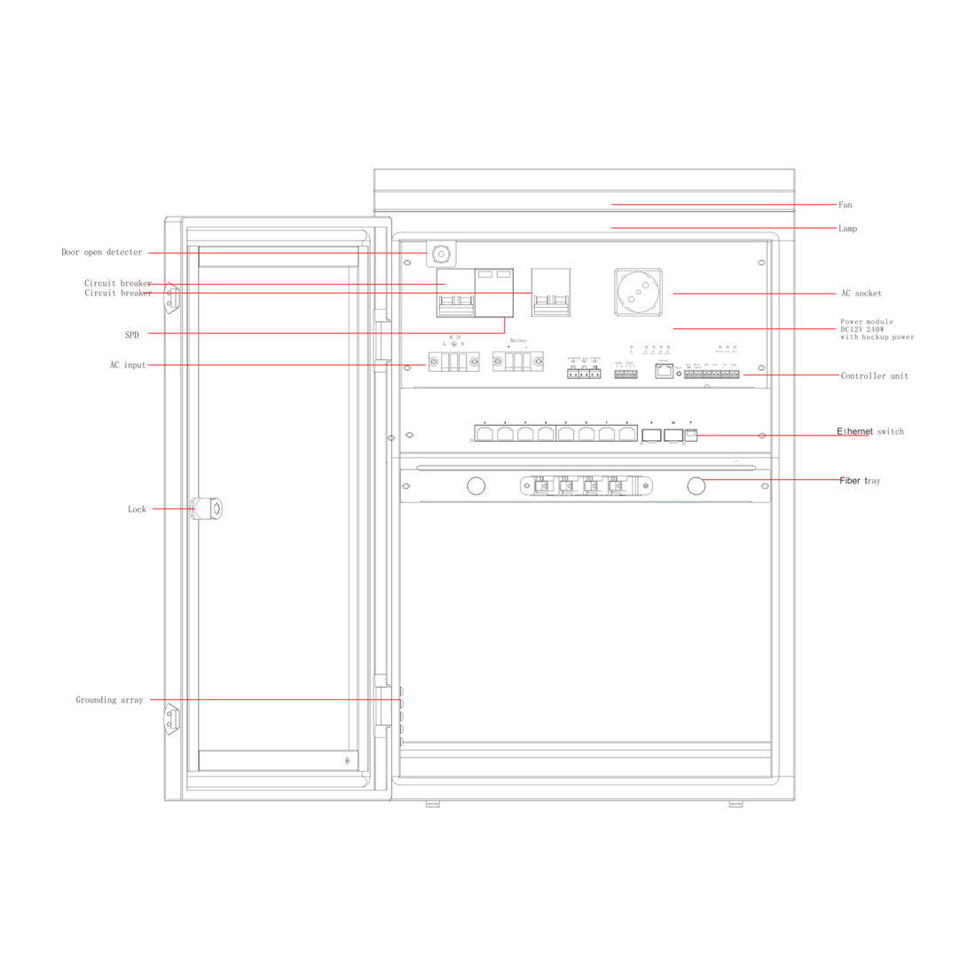 Armario de Conexiones Safire SF-BOX0812V-UPS-IP55 Armario de poliester SMC con grado de proteccion IP55. Incluye Switch Ethernet de 8 puertos 10/100/1000M y 2 SFP, y bandeja de fusion de fibra. Fuente de alimentacion AC 100-240V con 3 salidas DC 12V, max. 240W. Sistema UPS para bateria de backup 12V (no incluida) y proteccion contra sobretensiones AC. Plataforma de gestion remota, carril DIN, sensor de puerta con luz interna. Referencia fabricante: SF-BOX0812V-UPS-IP55