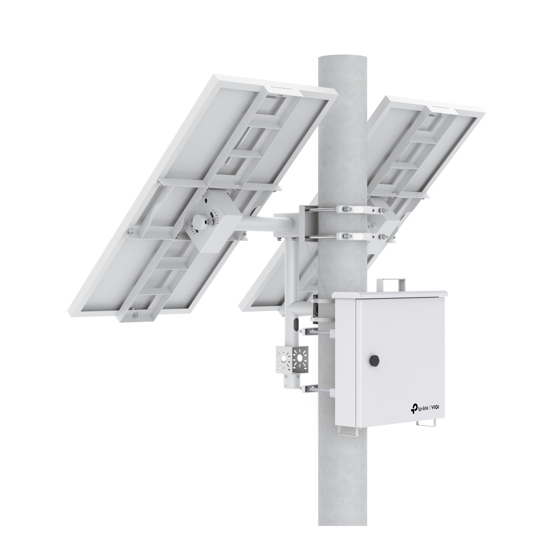 El sistema permite ajuste manual del ángulo de inclinación entre 5° y 55° y se instala directamente sobre poste vertical, siendo compatible con diámetros comprendidos entre 80 y 160 mm. Más información en la web oficial de TP-Link VIGI o en nuestra sección de alimentación autónoma.