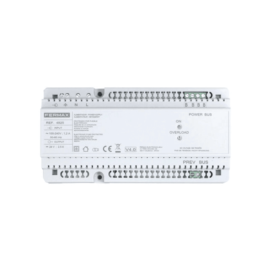 Se emplea para alimentar los diferentes equipos de una instalación DUOX PLUS de Fermax. Construida en material autoextinguible VO. Incluye un juego de tapas para proteger los terminales de conexión. Formato carril DIN-10 para facilitar su instalación en el interior de una caja de equipos eléctricos, o bien, se pueden atornillar directamente sobre la pared. Las conexiones POWER BUS proporcionan voltaje y datos. Las conexiones PREV BUS proporcionan sólo datos. Incluye 2 leds: - EN - SOBRECARGA: LED que indica el límite máximo de corriente excedido. Reduzca la carga. El LED ENCENDIDO + SOBRECARGA parpadeando indica un cortocircuito