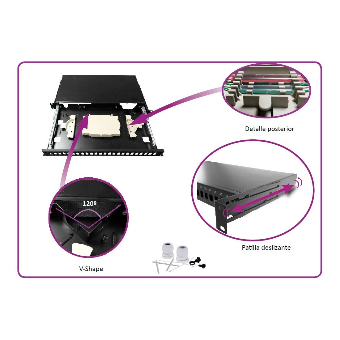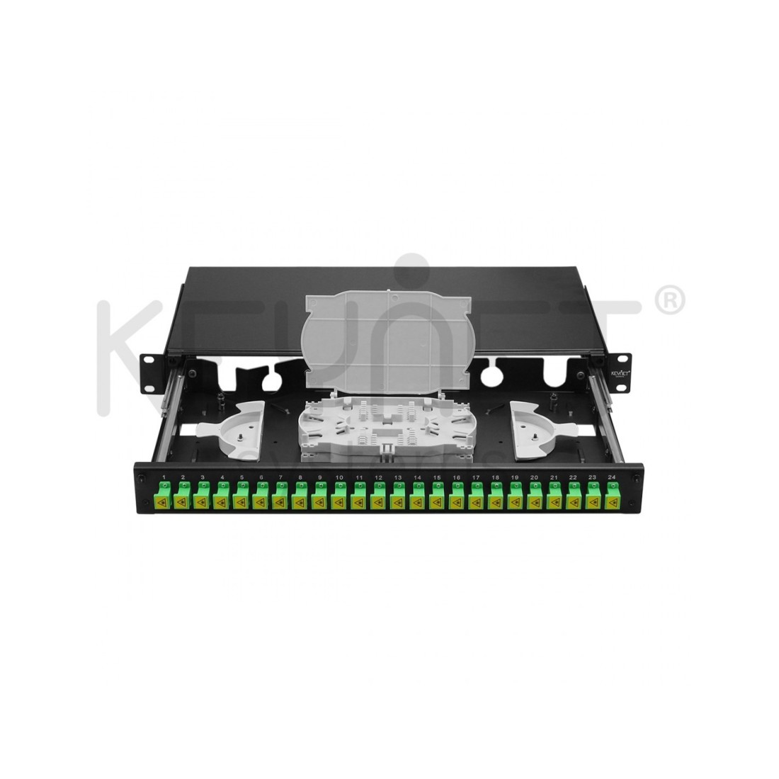 Bandeja de distribución de F.O. 19", hasta 24 SC o LC, 2 x 12 fo o 2x 24 fo (a doble altura) + tapa frontal telescópica. Vacío
