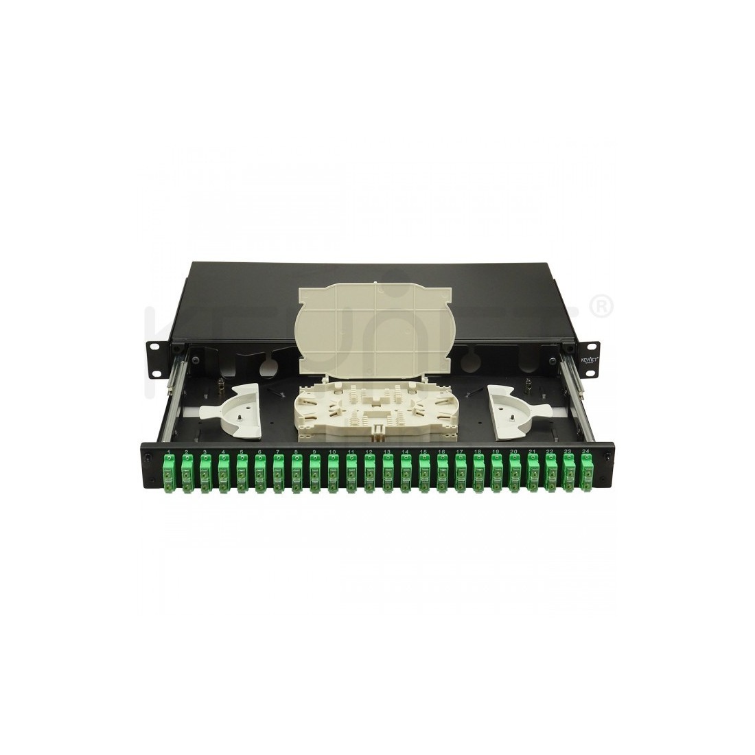 Bandeja de distribución de F.O. 19", telescópica incl 24SC/APC SX montados y accesorios. Tapones antipolvo
