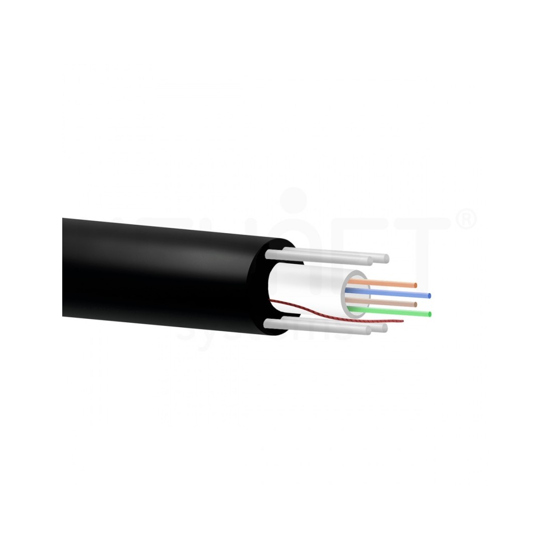 Cable fibra óptica holgada. Fibras 250 μm en tubo central con gel. Tensores en cubierta. 2 + 2 FRP. Cubierta HDPE.