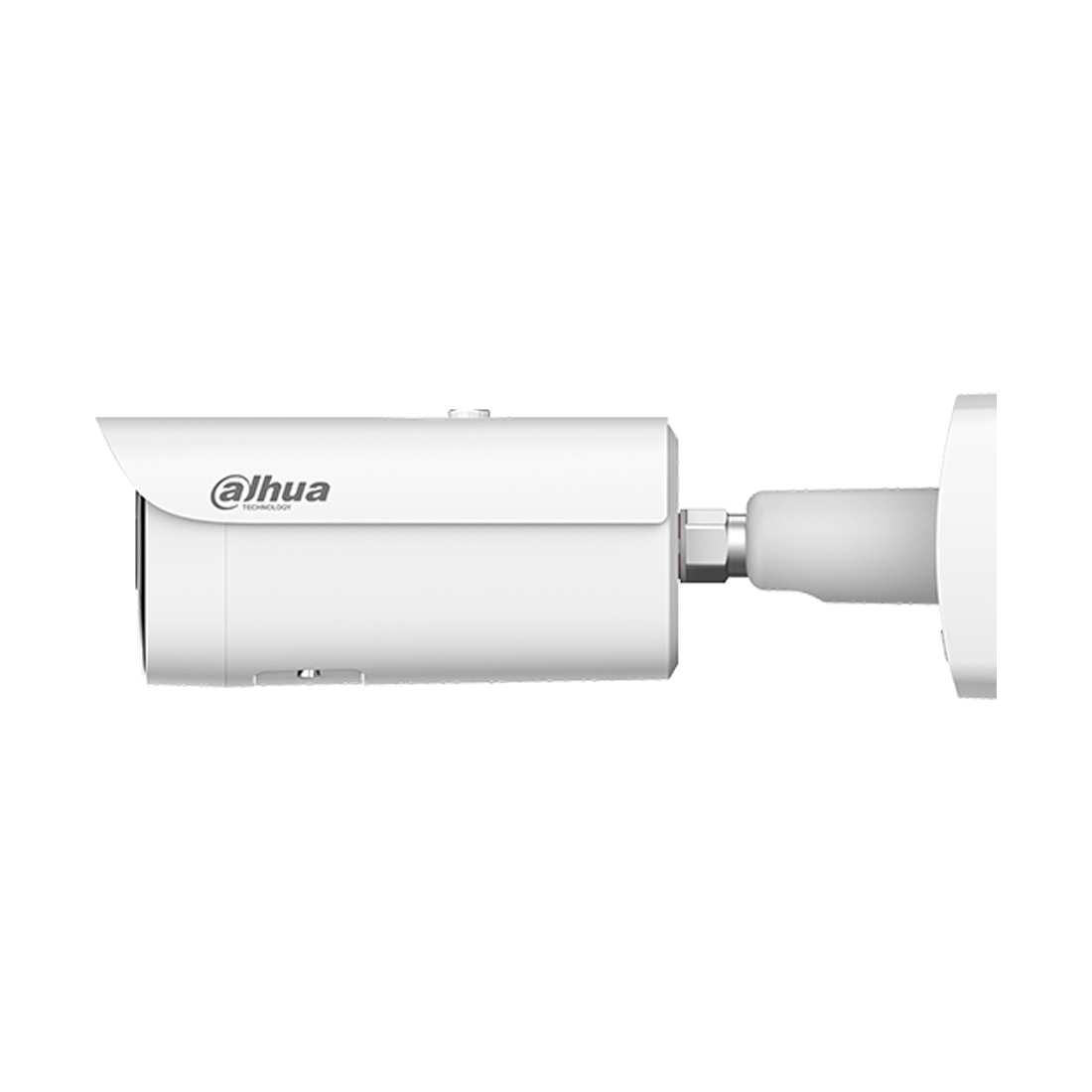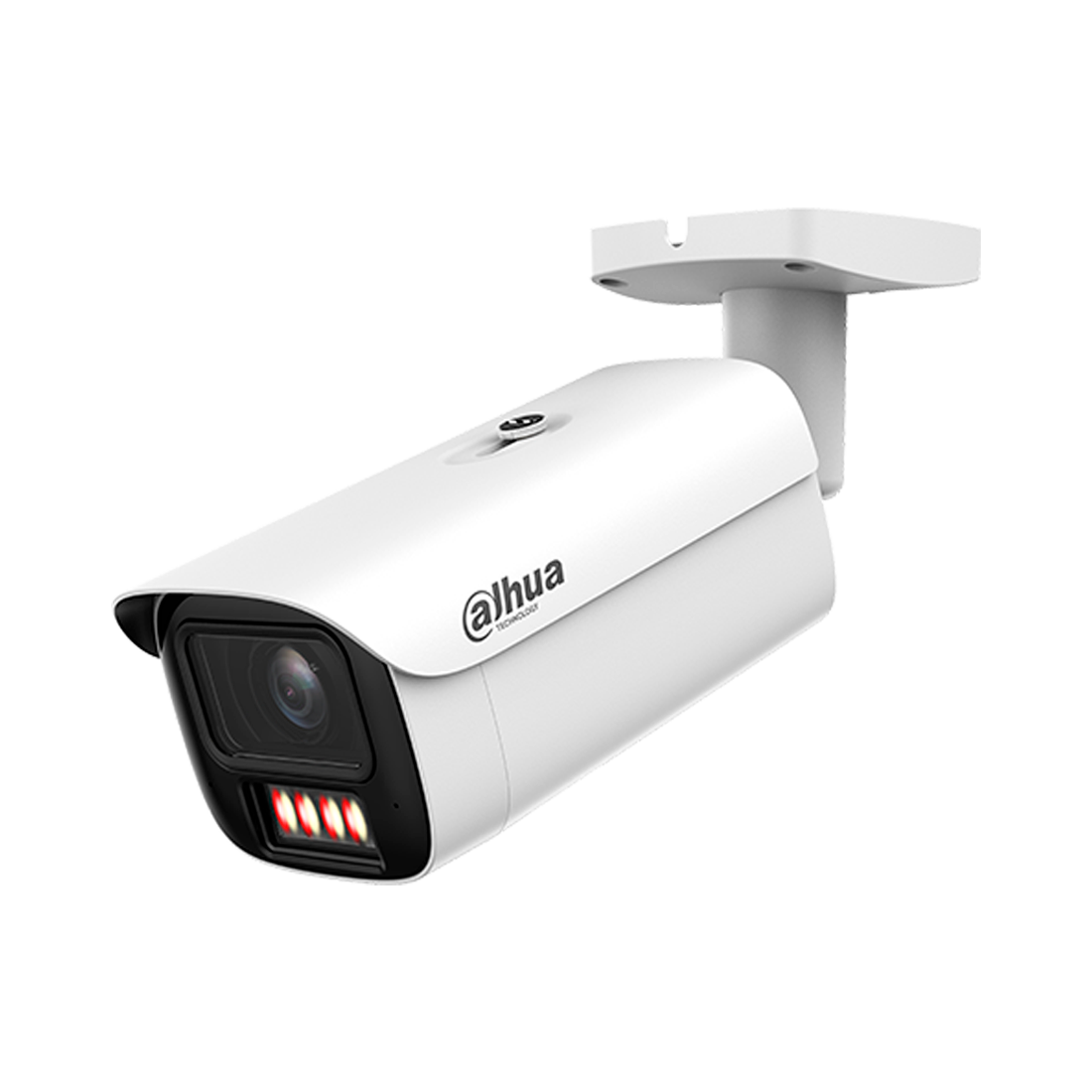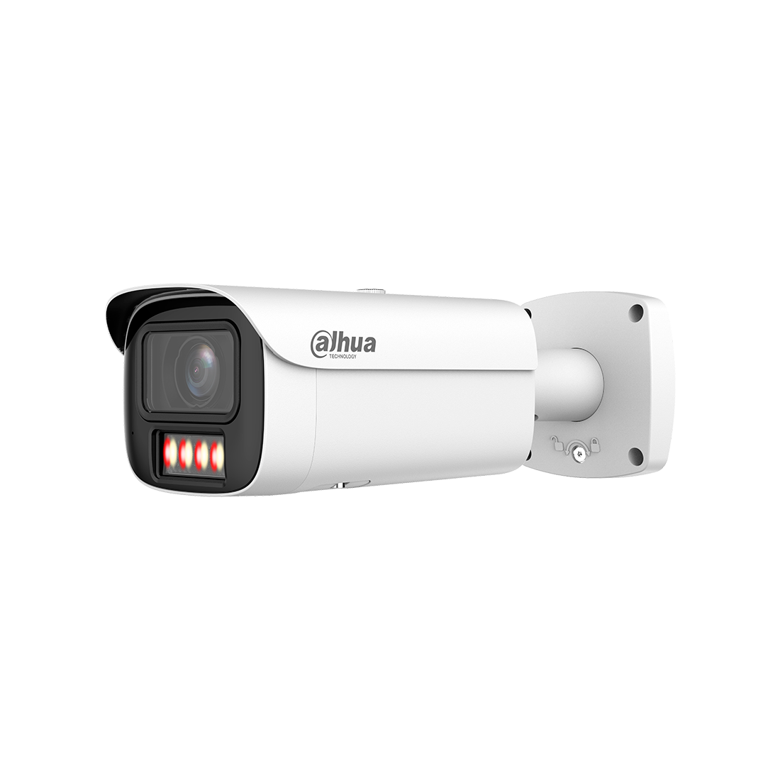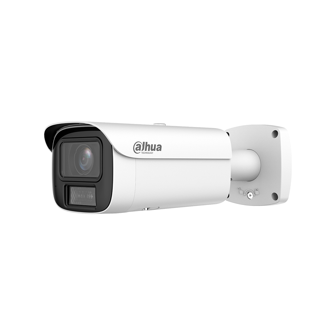 Dispone de lente varifocal motorizada de 2.7 a 12 mm con apertura F1.8 y sistema de iluminación Smart Dual Light con alcance de hasta 60 m en IR y luz blanca. Incorpora funciones de IA como AcuPick, detección facial, protección perimetral, metadatos de vídeo y conteo de personas, optimizando la precisión y reduciendo falsas alarmas.