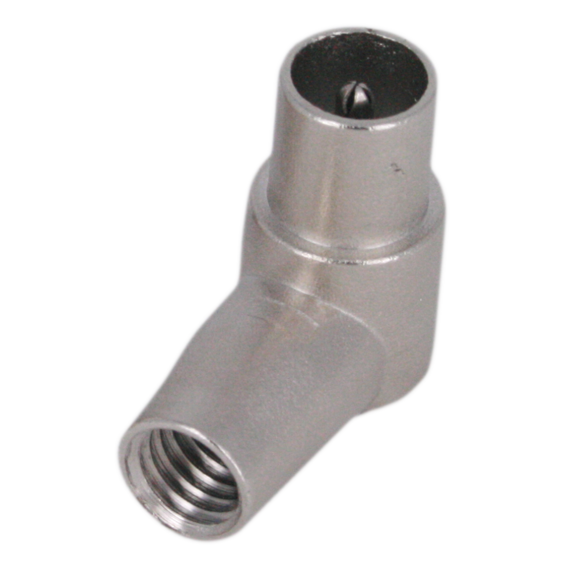 Primer conector metálico acodado del mercado fabricado en un único bloque de Zamak, que le confiere un apantallamiento Clase A++ *Muy utilizado en náutica