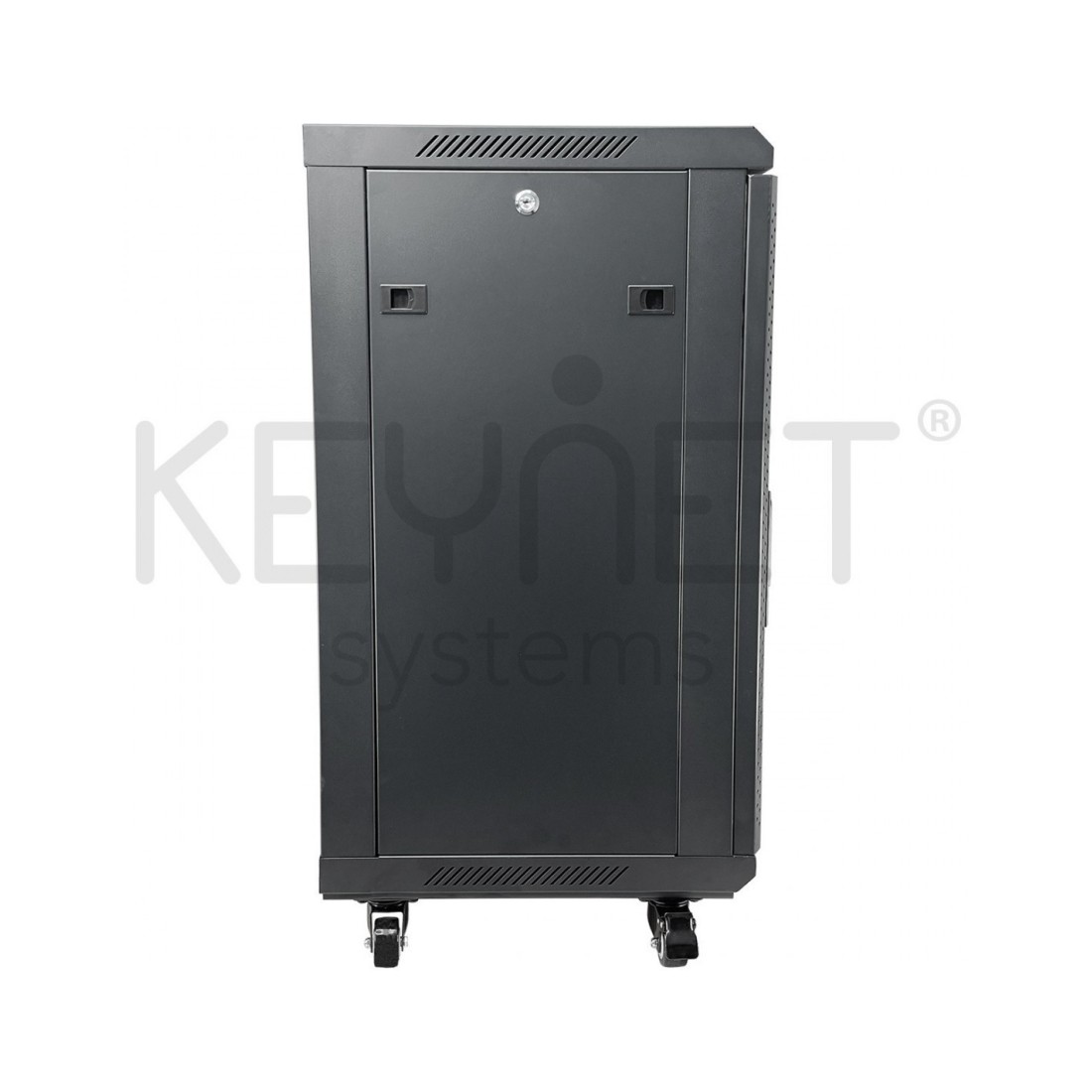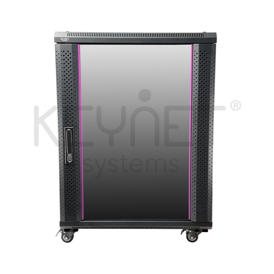 Rack 19" desmontado. Altura 18U. 600 x 600mm (Ancho x Fondo). Montaje en pared y suelo. Puerta cristal. Maneta giratoria con llave de alta calidad en puerta frontal. Ruedas (2 con freno) de 80mm. Carga estática 60Kg en pared y 150Kg a suelo con ruedas. Color Negro RAL9005.