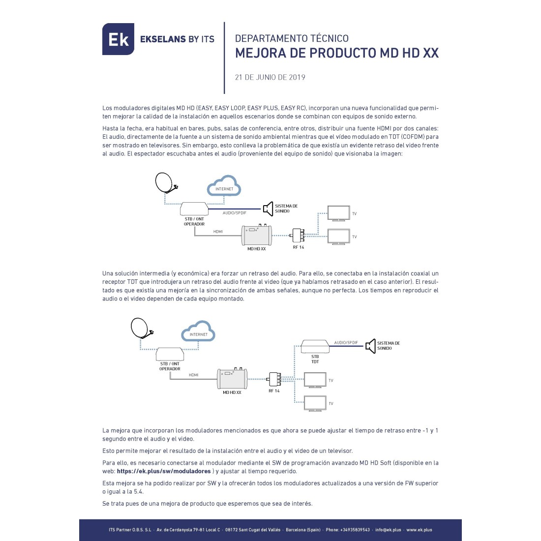 Nivel de salida (DIN 45004B): >80dBμV. Entrada de mezcla RF (5-862MHz). Excelente calidad de modulación MER 33 dB Resolución hasta 1080p Menú rápido. Ajuste fácil mediante botones del canal y atenuación Programación avanzada fácil mediante programa PC Elevado margen dinámico (>80dB) recepción IR Compatible con receptor IR universal, modelo TRC (No incluido)