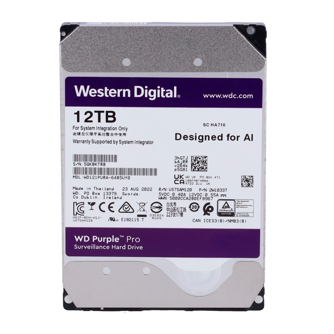 Disco duro Western Digital Capacidad 12 TB Interfaz SATA 6 Gb/s Modelo WD121PURZ-64B5UY0 Especial para Videograbadores Suelto o instalado en DVR