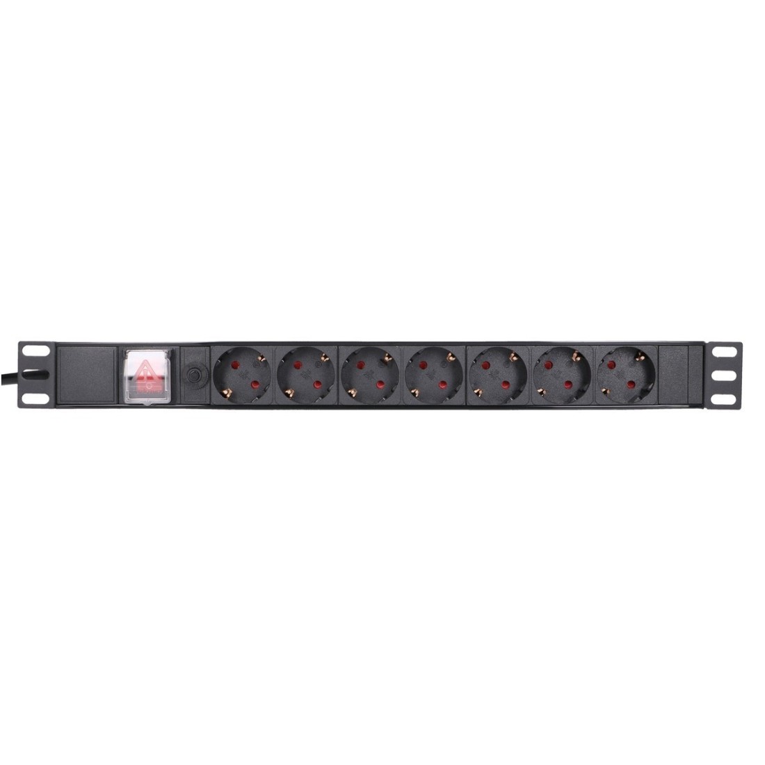 Regleta horizontal de Extralink con 7 enchufes y un interruptor de dos polos para un rápido encendido y apagado. Es de 1U de altura y tiene un espacio de montaje ideal para todos los armarios de 19", tanto colgando como de pie.