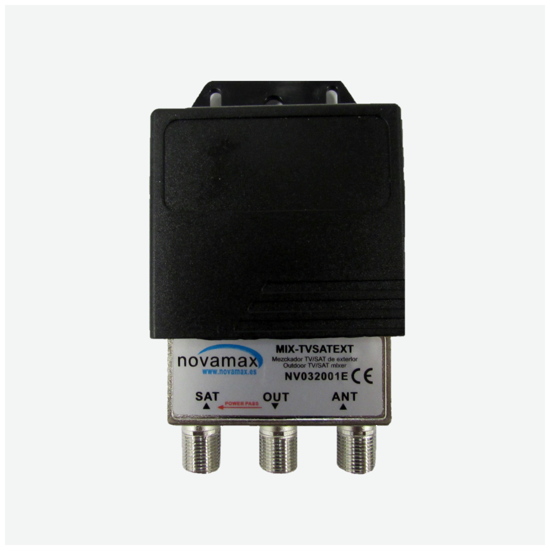 Mezclador RF/SAT, con conector F todos misma dirección, para mástil, de Exterior. Blindado, cajita protectora.