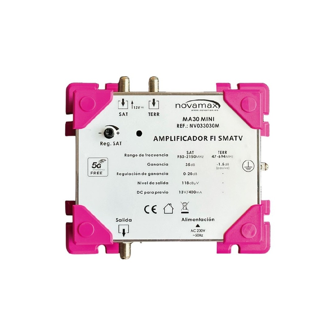 Rango deregulación de 20 dB (SAT). Libre de interferencias de señales de móvil LTE700 (5G). Alimentación LNB de 13VDC (400mA) en banda satélite. Se puede sujetar en la pared (Incluye soporte) Fuente de alimentación interna AC 230V