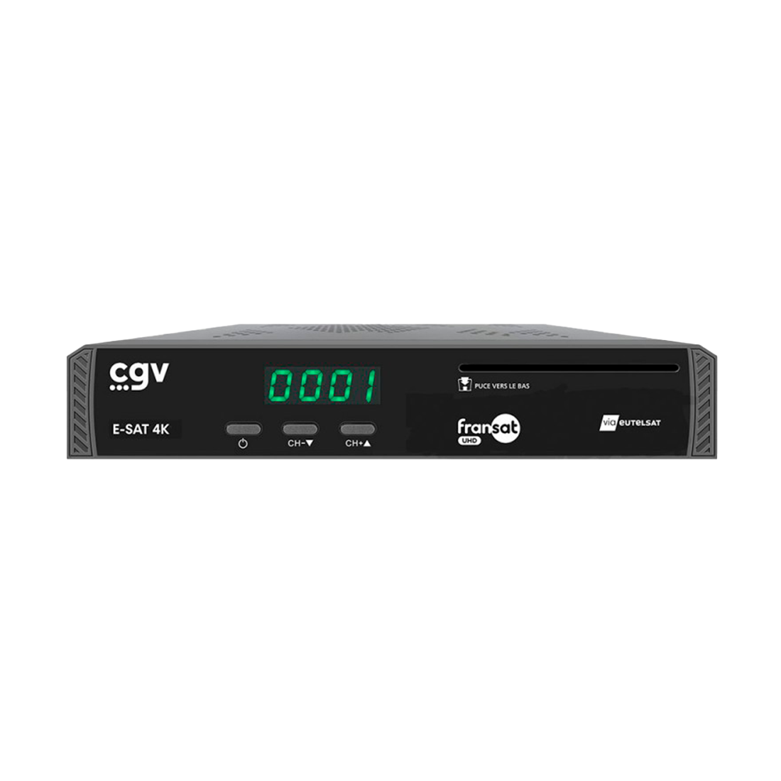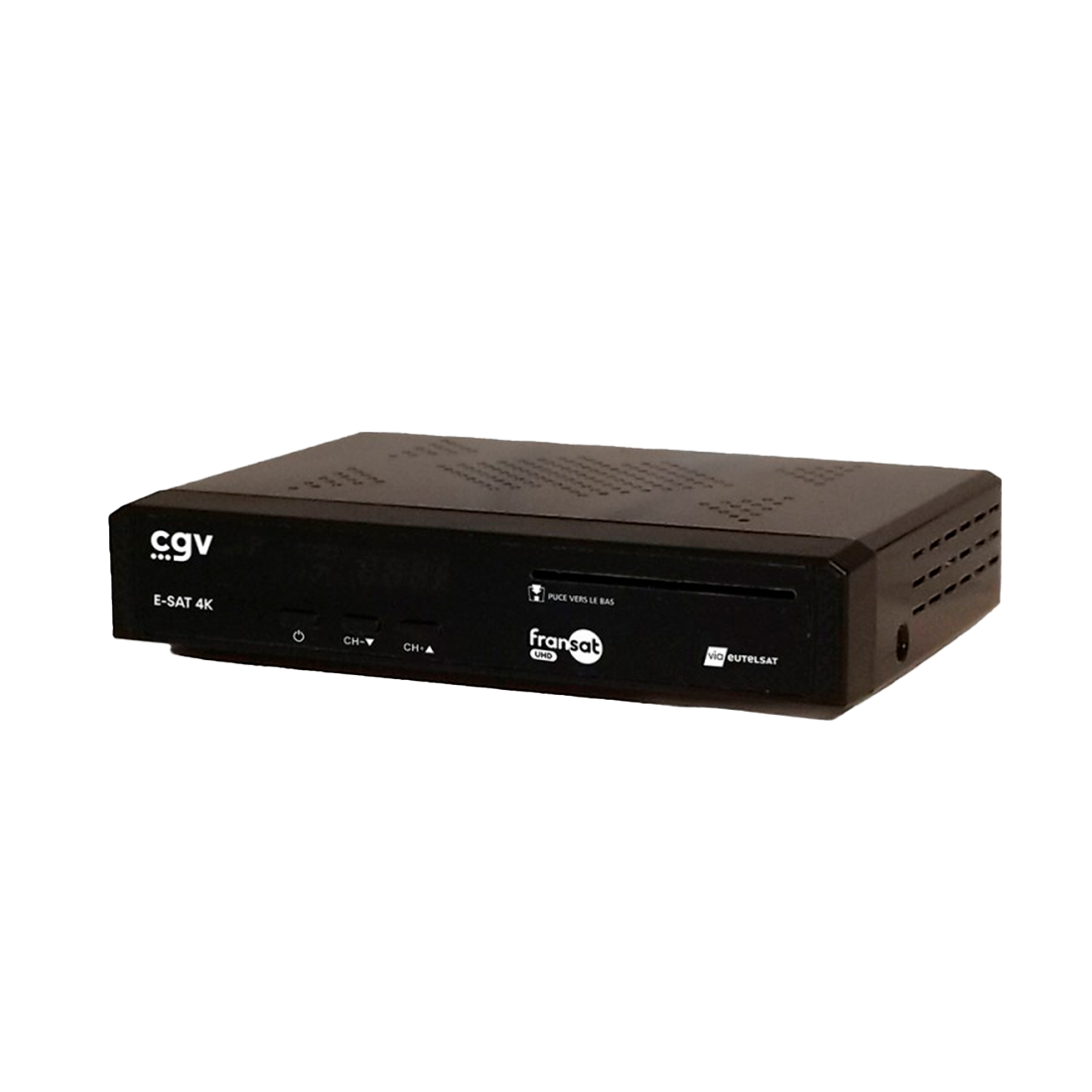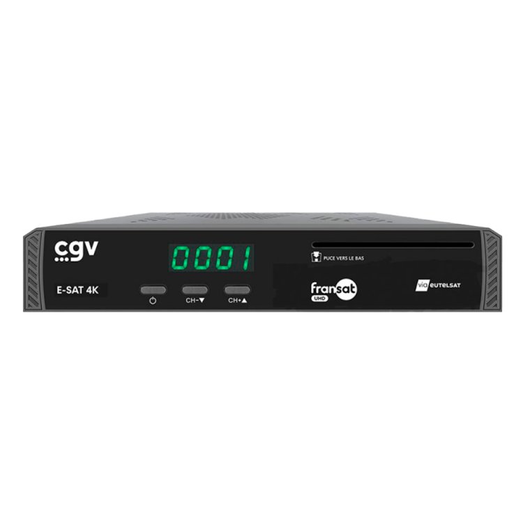 El Receptor Satélite CGV E-SAT 4K Fransat es un receptor satélite UHD diseñado para la recepción de los canales de la TNT gratuita por satélite a través de Eutelsat 5W, con certificación oficial Fransat. Incorpora tarjeta de acceso Fransat UHD incluida y soporte para DVB-S y DVB-S2, permitiendo la visualización de contenidos en Alta Definición y Ultra Alta Definición 4K.