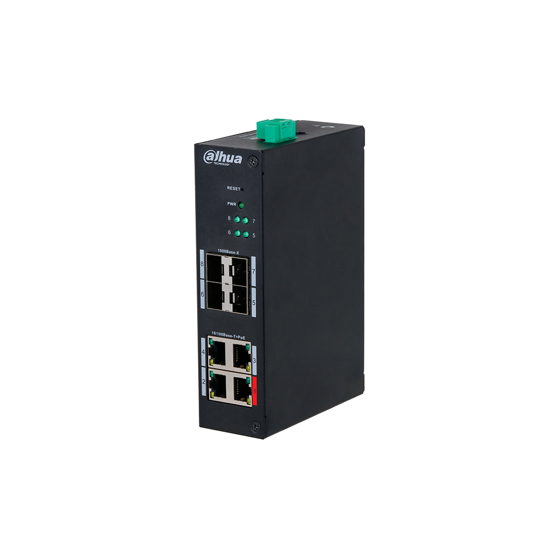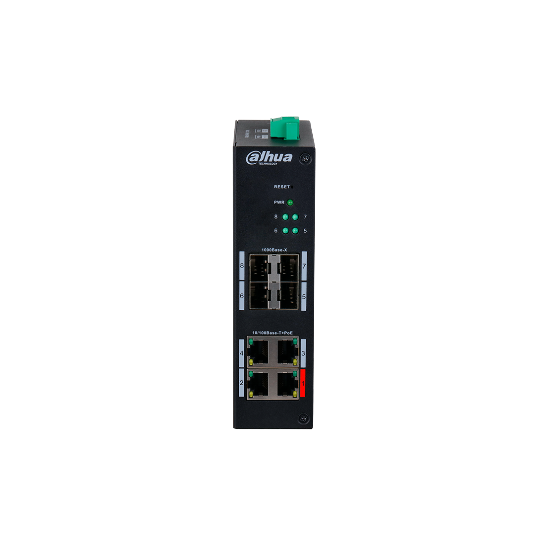 Switch Industrial Dahua DH-HS4408-4ET-96 Switch Gestionado (Managed L2) con 4 puertos PoE 10/100 Mbps y 4 puertos SFP Gigabit. Potencia total PoE 96W. Puerto 1 soporta Hi-PoE/802.3bt (max 90W). Soporta transmision PoE larga distancia 250m. Capacidad de conmutacion 8.8 Gbps. Proteccion contra rayos 4KV. Montaje en carril DIN. Referencia fabricante: DH-HS4408-4ET-96