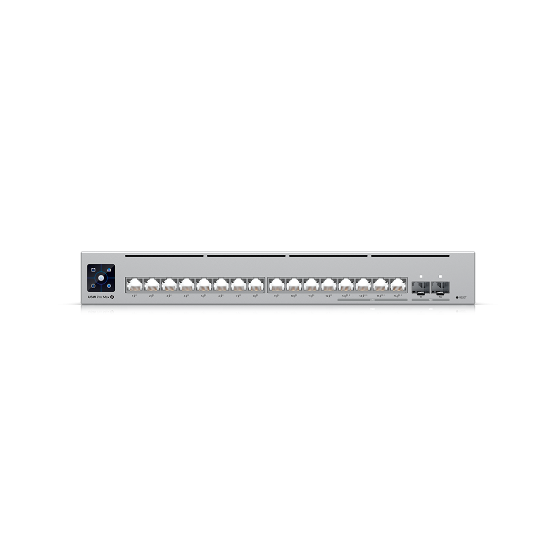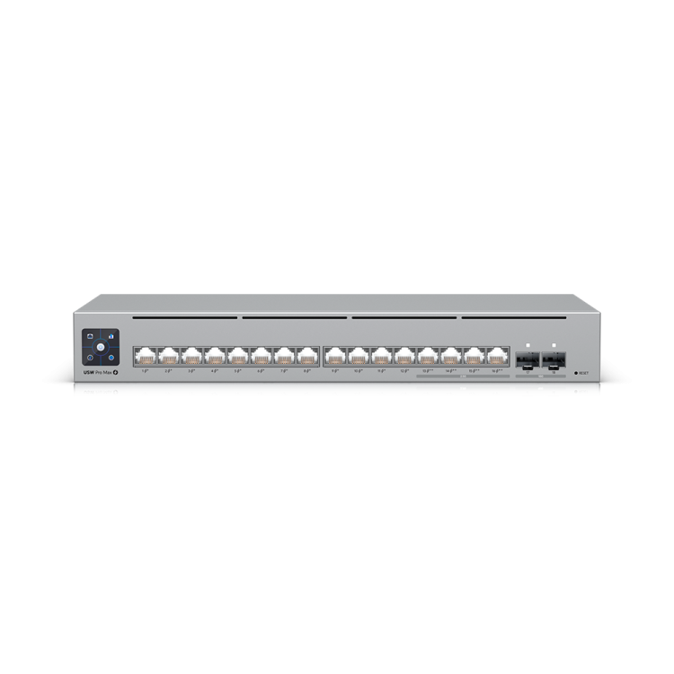 Switch Gigabit Ubiquiti USW-Pro-Max-16 12 puertos GbE y 4 puertos 1/2.5G 2 puertos SFP+ 10G Pantalla LCM 1.3 pulgadas Funciones L2/L3 con VLAN, LACP y DHCP Dimensiones 325.1x160x43.7 mm Ref. USW-Pro-Max-16