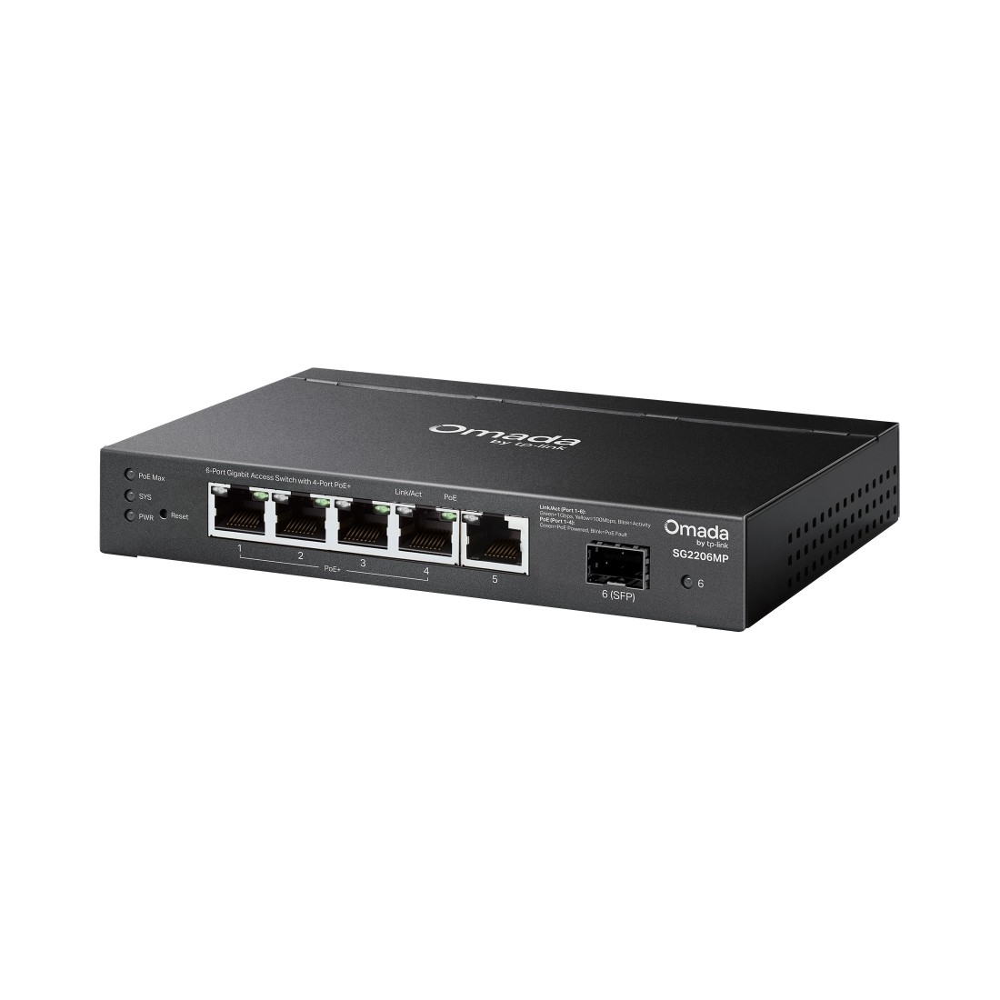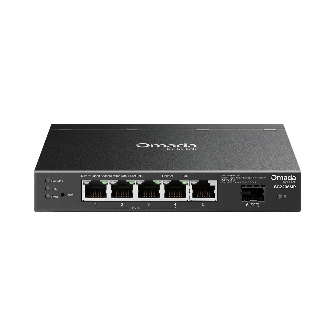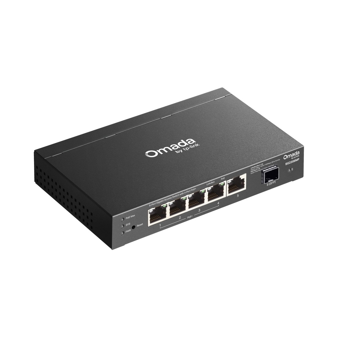 El switch PoE TP-Link SG2206MP es un switch gestionable de acceso que ofrece conectividad Gigabit con funciones avanzadas de red. Incorpora 6 puertos, incluyendo 4 puertos PoE+ y 1 ranura SFP, proporcionando alimentación y datos a dispositivos como cámaras IP, puntos de acceso o teléfonos VoIP.