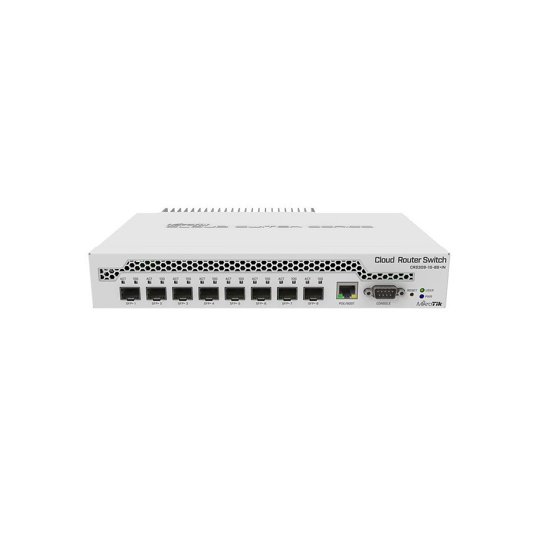 El CRS309-1G-8S + es un conmutador de red muy compacto pero potente. Tiene ocho ranuras SFP +, que admiten hasta un módulo de 10 Gbit en cada una, lo que da como resultado una capacidad de conmutación total de 162 Gbps y un rendimiento total sin bloqueo de 81 Gbps.