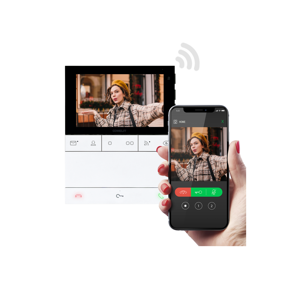 Monitor manos libres Wi-Fi de 5 pulgadas, color. Tecnología NFC para programarlo con la App incluso sin conectar a la placa. Tecnología 2 hilos digital compatible con sistemas Simplebus 2. Integración con App Comelit y asistentes de voz (Alexa/Google Assistant). Función de Reconocimiento facial y Memo vídeo de 8 grabaciones. Pantalla con resolución de 800x480 píxeles y Menú OSD. 9 pulsadores mecánicos, 6 de ellos programables. Función no molestar y Ayuda personas con visibilidad reducida. Derivador 1214/2C NO incluido. Dimensiones: 135 x 170 x 23 mm