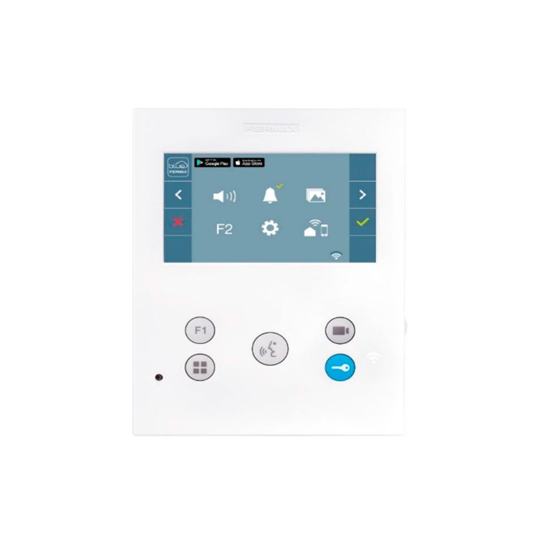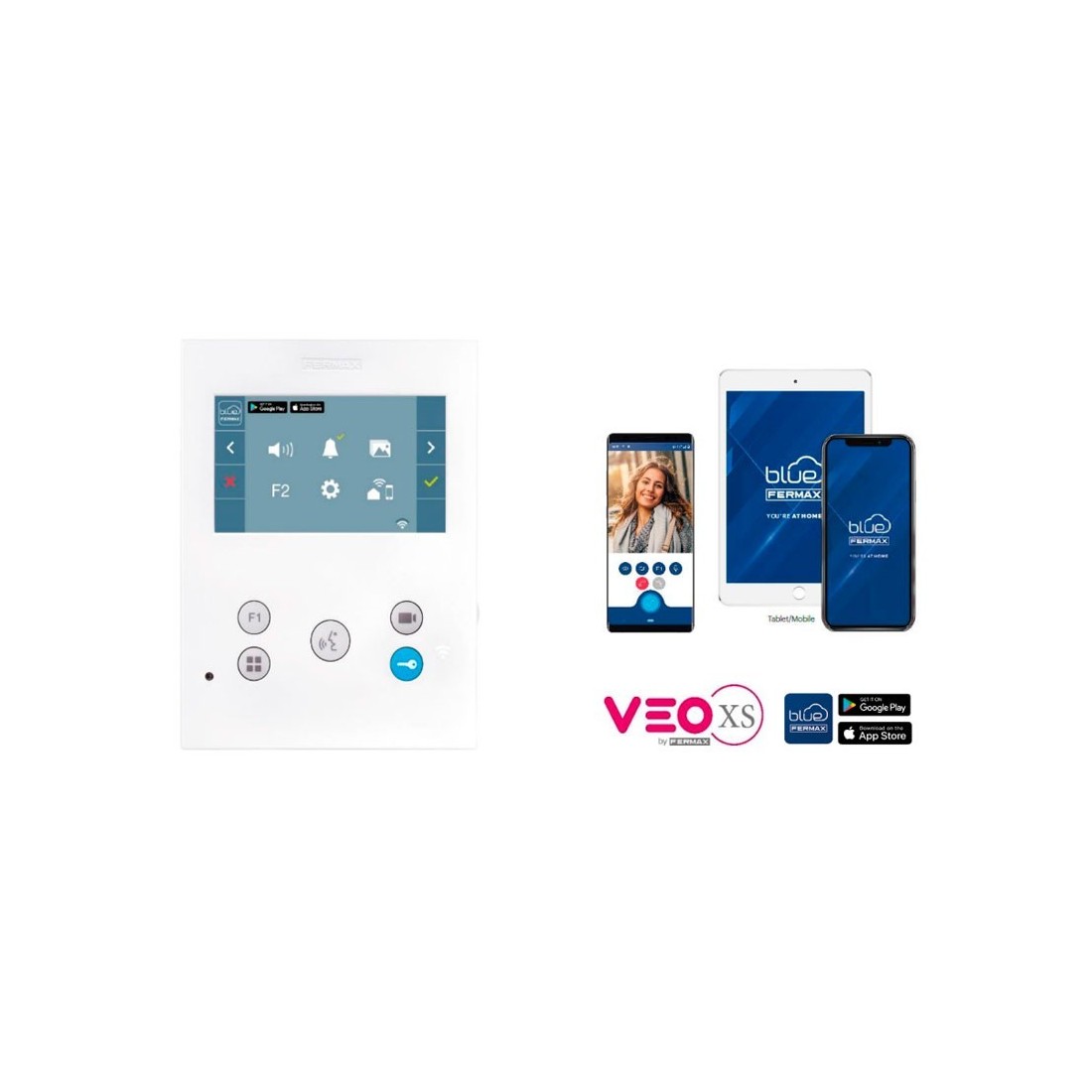 VEO-XS WIFI está equipado con conexión Wi-Fi que permite el desvío de llamadas a dispositivos móviles. Gracias a la aplicación BLUE de Fermax, disponible de forma gratuita en Play Store y App Store, las funciones del videoportero se pueden gestionar directamente desde un móvil o tablet, para conectarte a tu hogar, estés donde estés.