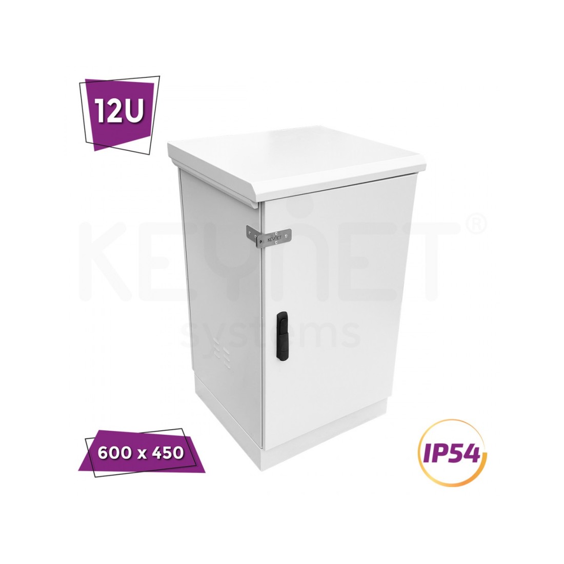 El Armario rack Keynet FRC-A-U-1264-P4-NGN es un armario metálico de 19” con 12U de altura y dimensiones 600 × 450 mm. Incorpora paredes y puerta de doble chapa de 1,5 mm con aislamiento térmico, garantizando protección frente a agua y polvo con nivel IP54.