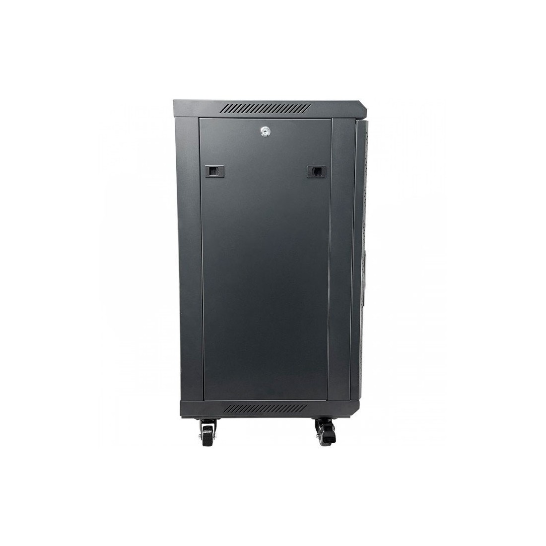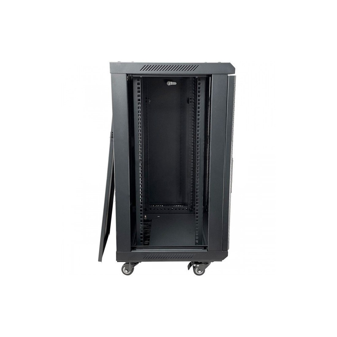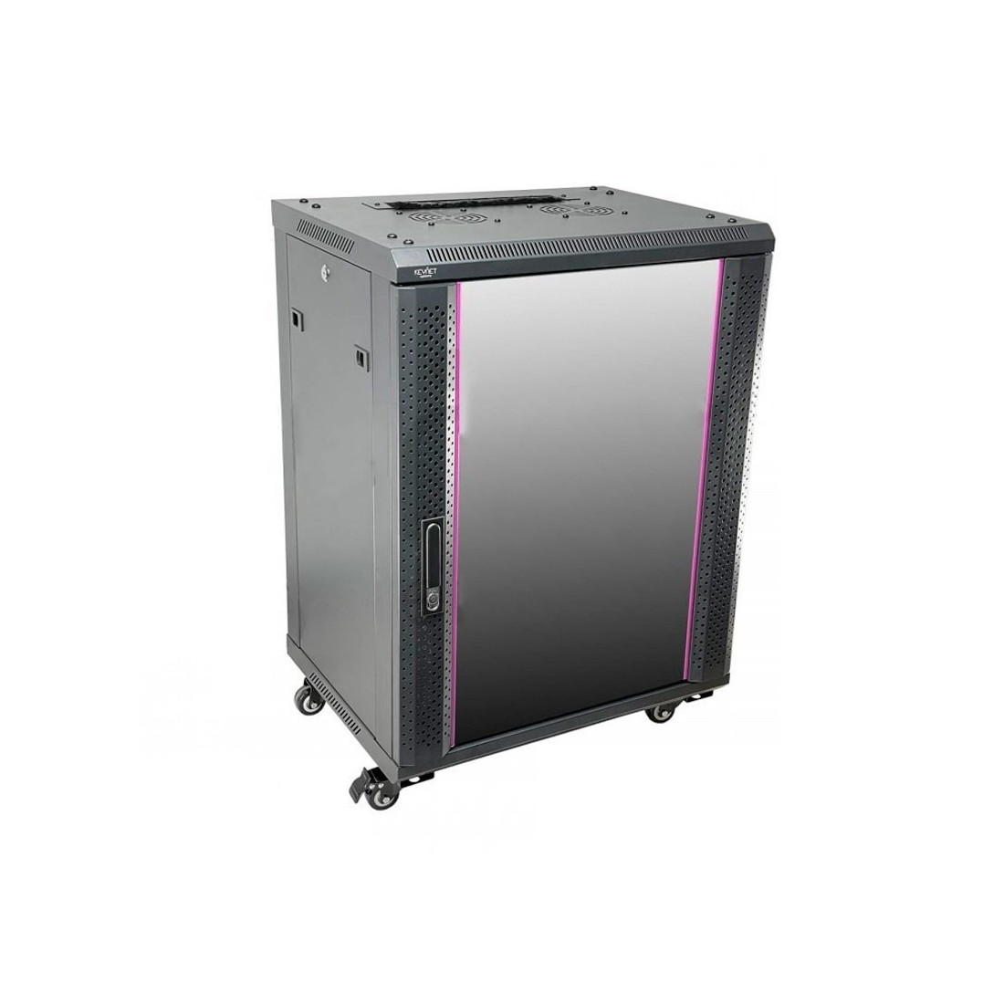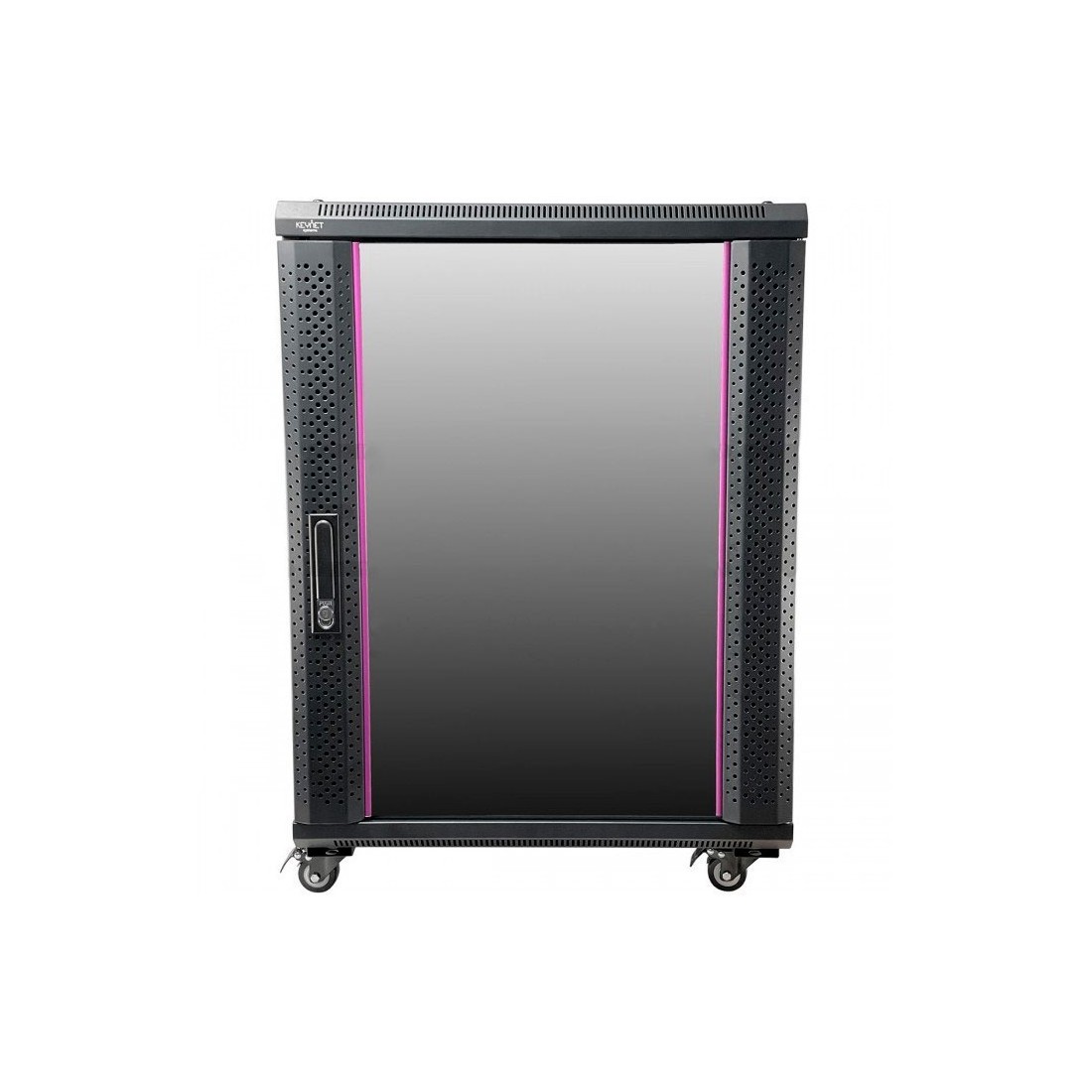 Armario rack mural 19" Keynet FR6-C1566 Rack 19 pulgadas para instalación mural o suelo Altura 15U con dimensiones 600x600x770 mm Puerta frontal de cristal con cerradura y apertura reversible 180 grados Paneles laterales desmontables con cerradura Estructura en acero SPCC en color negro RAL9005 Guías frontales y traseras numeradas Entrada de cableado superior e inferior con cepillo antipolvo Incluye ruedas con freno para instalación en suelo Capacidad de carga hasta 60 kg en pared y 150 kg en suelo Incluye kit de tornillería y soporte de fijación