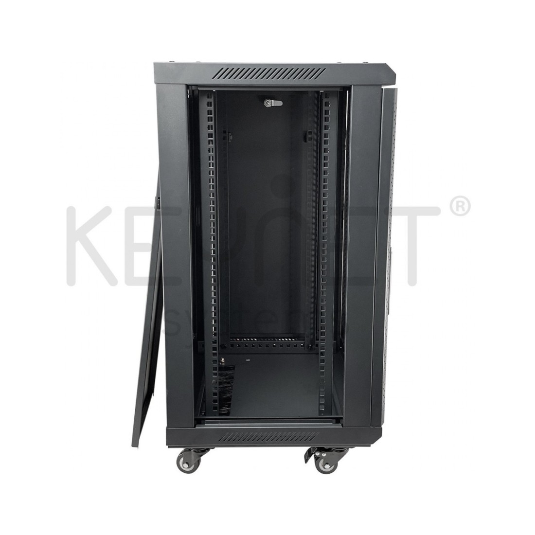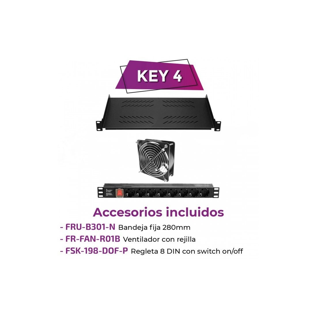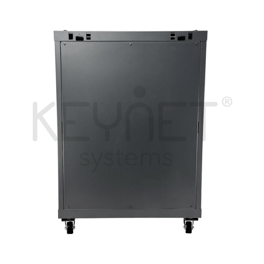 Armario rack mural 19" Keynet FR6-C1566-U Rack 19 pulgadas de estructura robusta para instalación mural o suelo Altura 15U con dimensiones 600x600x770 mm Suministrado desmontado para transporte optimizado Puerta frontal de cristal con cerradura y apertura reversible 180 grados Paneles laterales desmontables con cerradura Estructura en acero SPCC en color negro RAL9005 Guías frontales y traseras numeradas Entrada de cableado superior e inferior con cepillo antipolvo Incluye ruedas (2 con freno) para instalación en suelo Capacidad de carga hasta 60 kg en pared y 150 kg en suelo Incluye kit de tornillería y accesorios de fijación