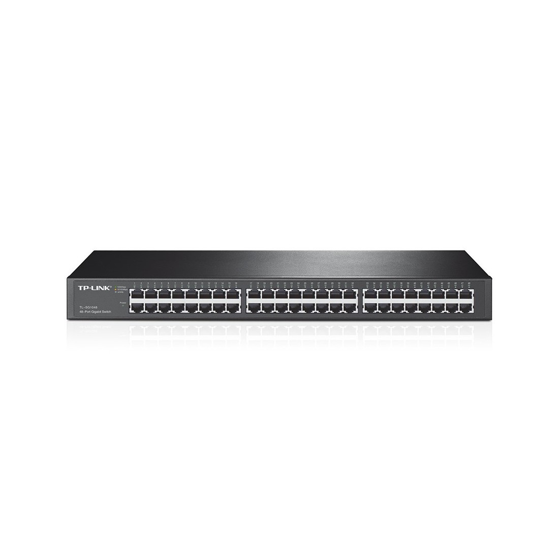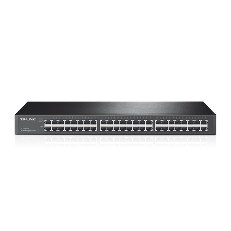 48 puertos RJ45 a 10/100/1000 Mbps Soporta aprendizaje de direcciones MAC (Auto-Learning) y MDI/MDIX automático Carcasa metálica estándar de 19 pulgadas Dimensiones: 440 x 360 x 44 mm