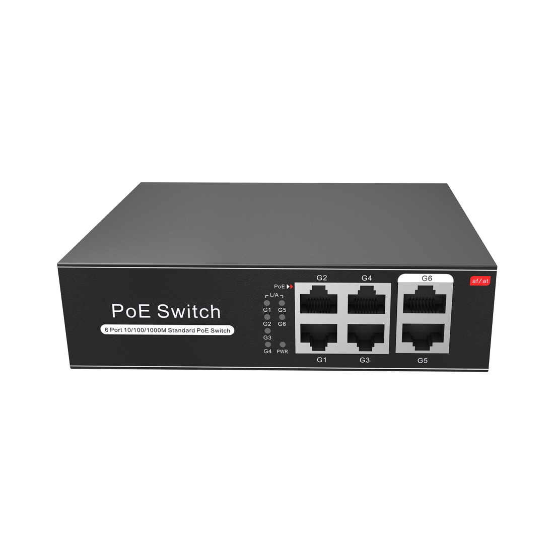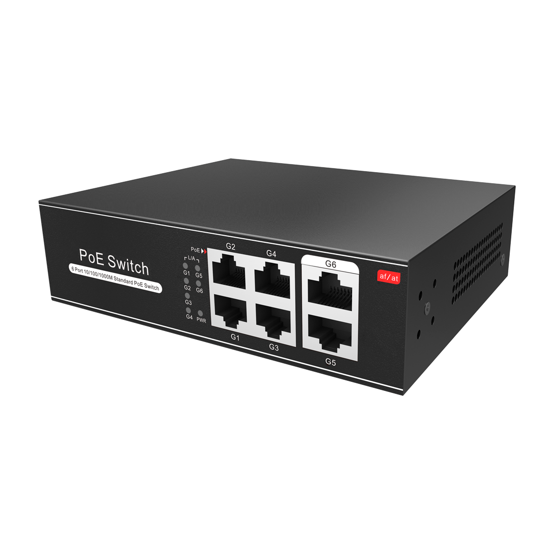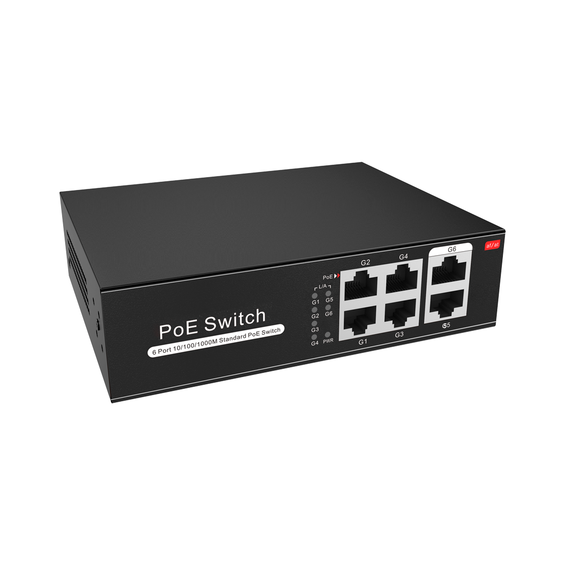 Switch PoE 4 puertos PoE + 2 Uplink RJ45 Velocidad hasta 1000 Mbps en todos los puertos Hasta 60W en total para todos los puertos Ancho de banda 12 Gbps Norma IEEE802.3af (PoE) / at (PoE+)