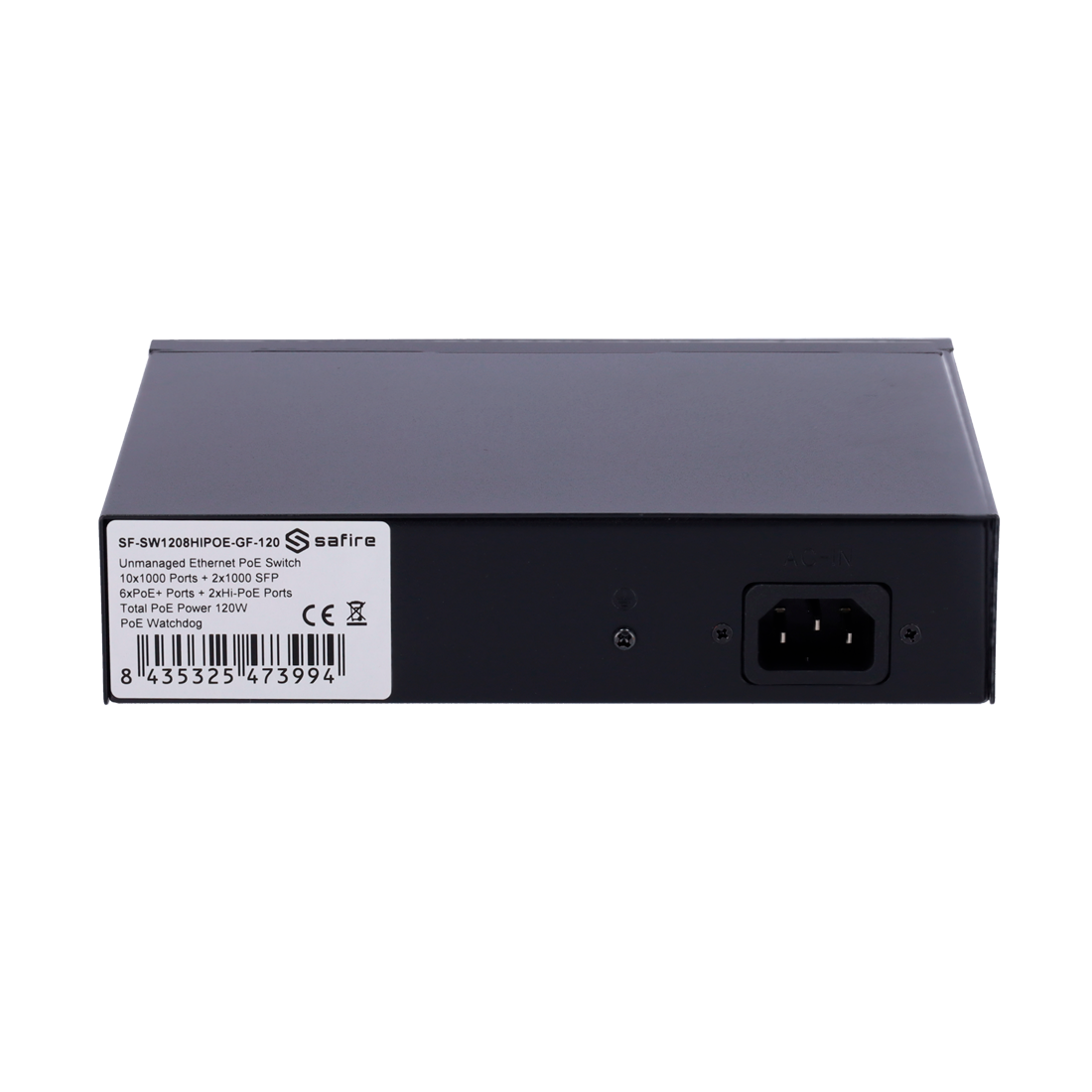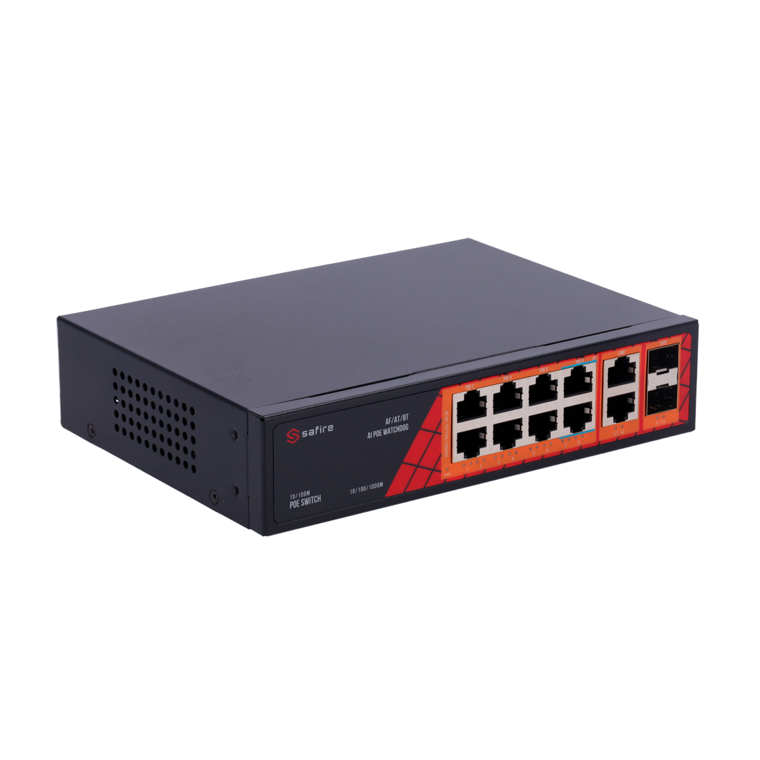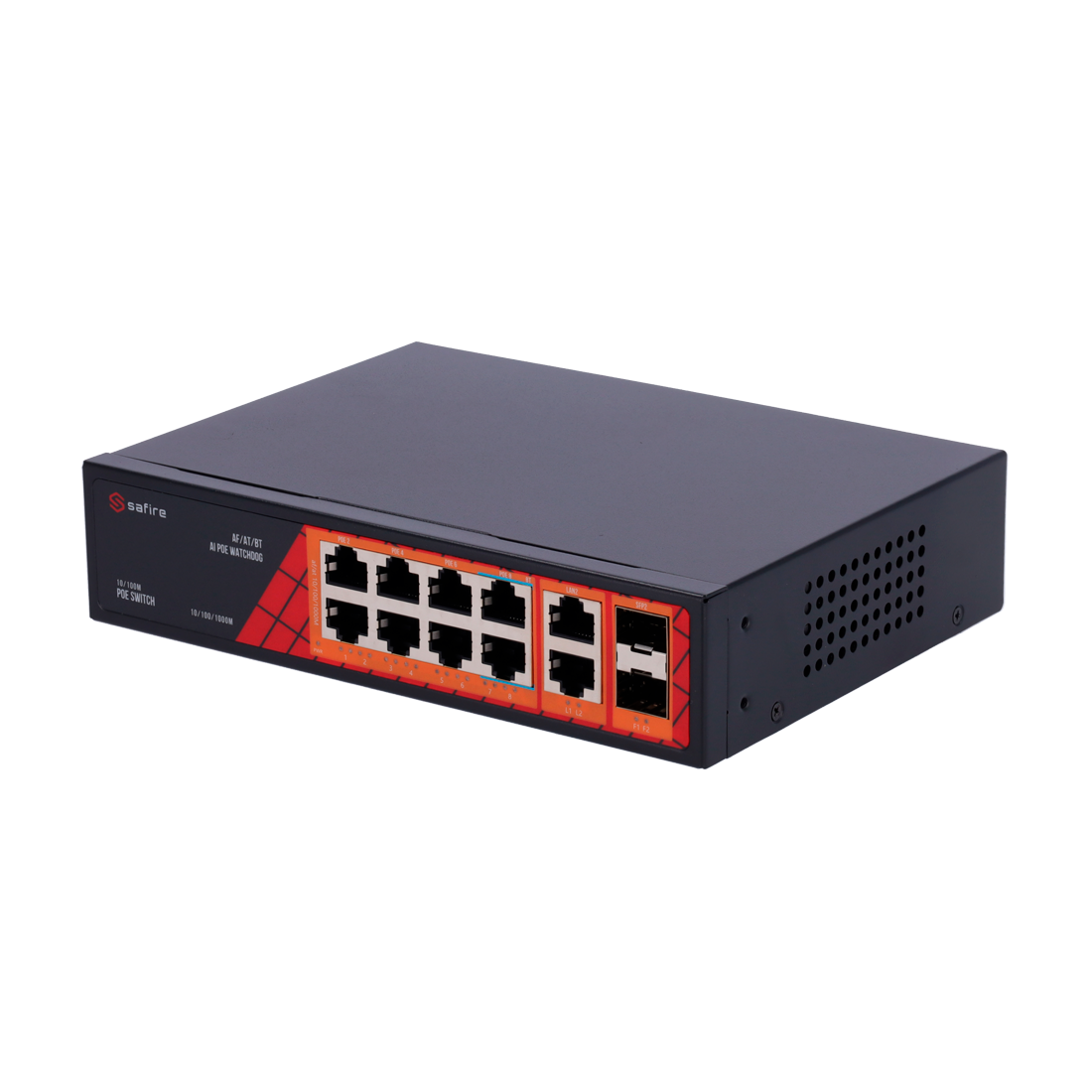 Safire Switch Hi-PoE 8 puertos PoE + 2 SFP + 2 RJ45 Velocidad de puertos Gigabit 10/100/1000Mbps 6 Puertos PoE+ 30W + 2 Puertos Hi-PoE 60W PoE Watchdog Hasta 120W Potencia PoE total