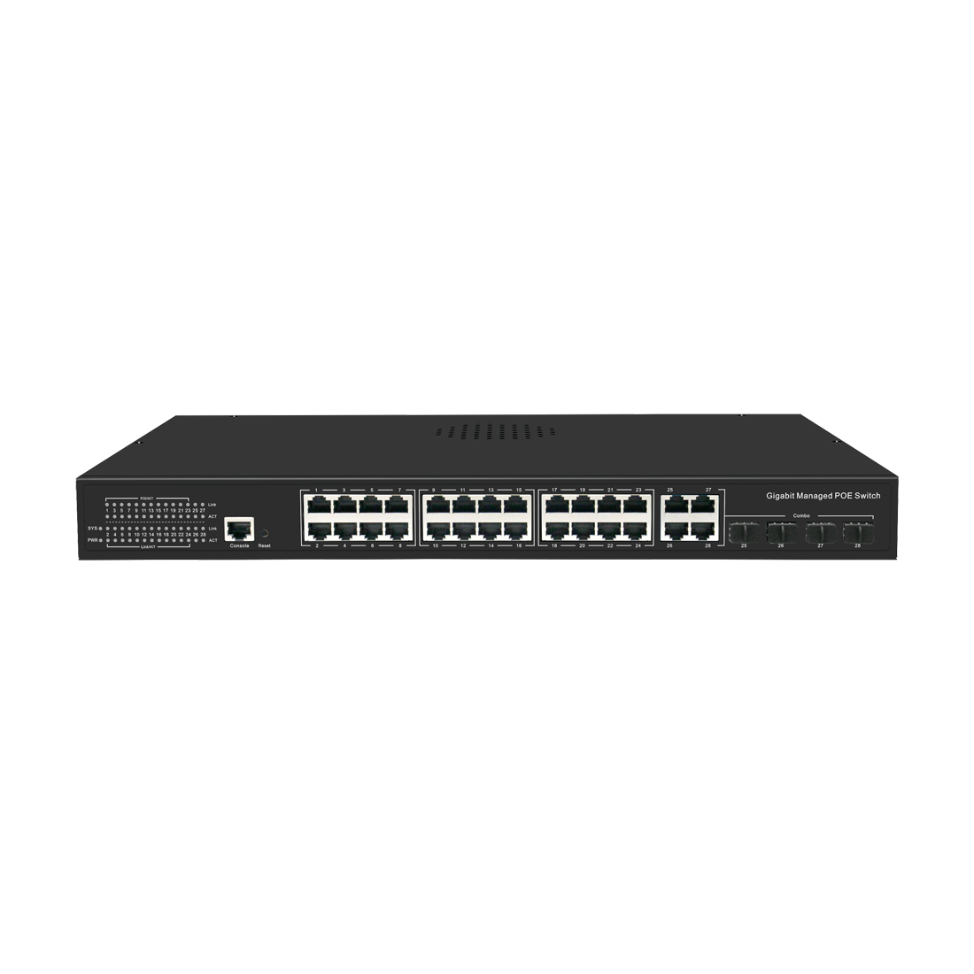 24 puertos PoE + 4 Combo RJ45 + 4 Combo SFP |
