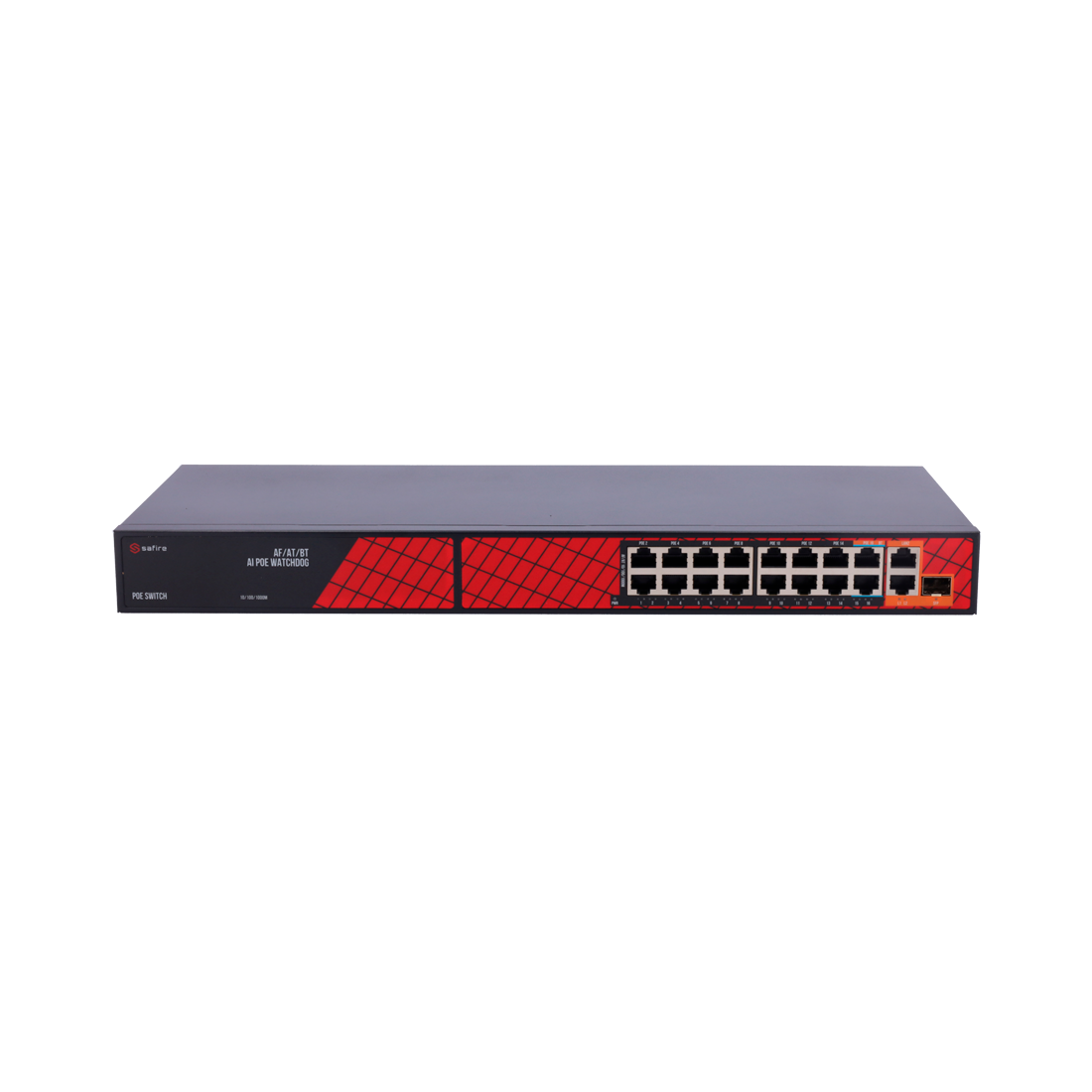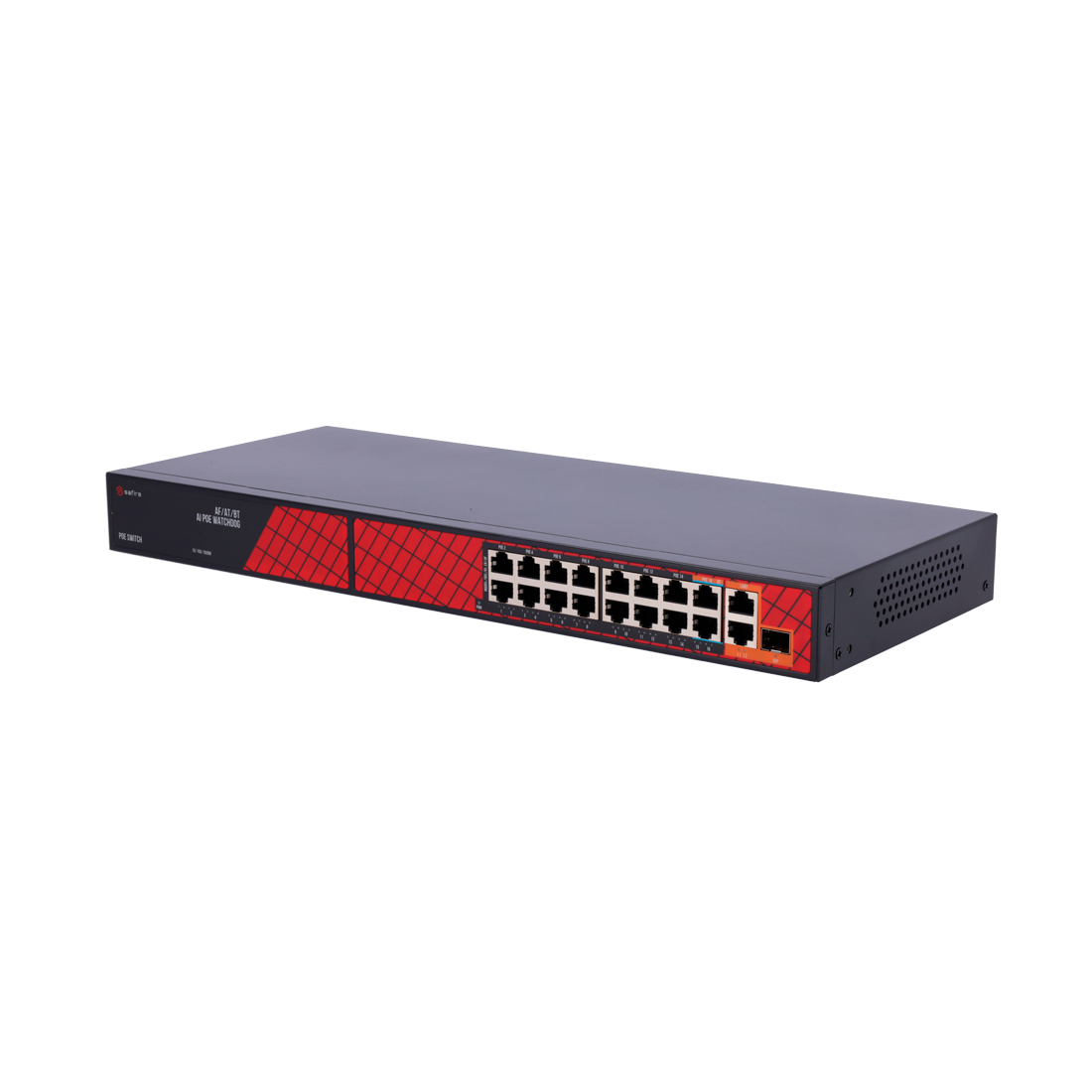 Safire Switch Hi-PoE 16 Puertos PoE + 2 Uplink RJ45 + 2 Uplink SFP Hibrido 15x10/100Mbps + 4x10/100/1000Mbps 14 Puertos PoE+ 30W + 2 Puertos Hi-PoE 60W PoE Watchdog / PoE Extendido Hasta 300W Potencia PoE total
