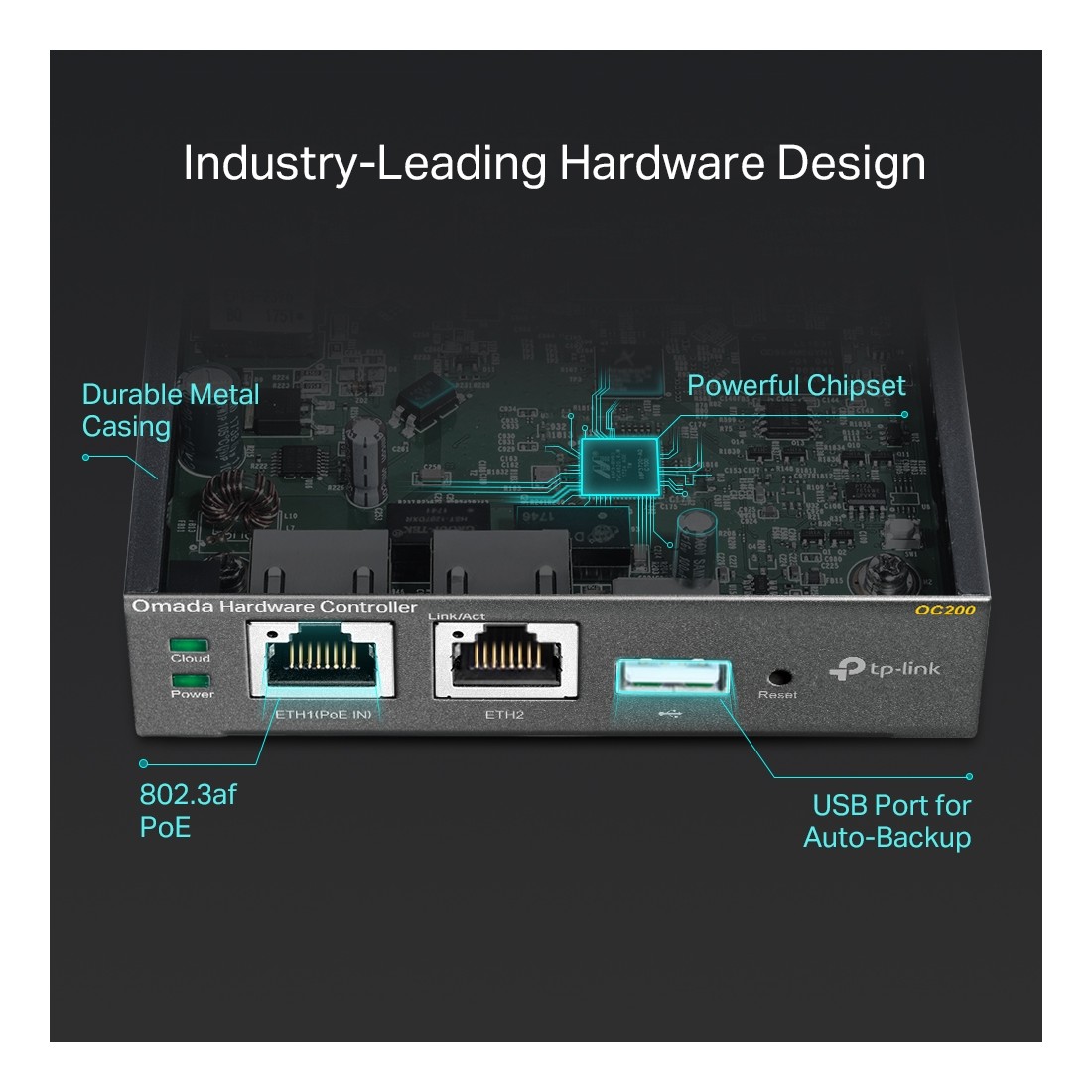 Controlador hardware Omada Gestión centralizada de hasta 100 AP, 10 gateways y 20 switches Acceso cloud y gestión local 2 puertos Gigabit RJ45, USB 2.0 para backup Alimentación PoE 802.3af o Micro USB 5 V Referencia OC220