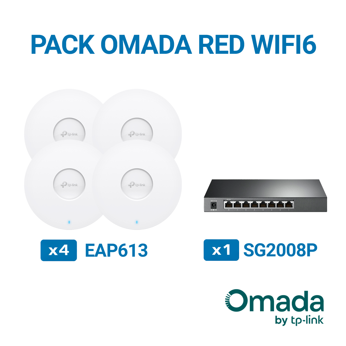 Pack de red inalámbrica WiFi 6 de Omada by TP-Link compuesto por 1 switch SG2008P, 4 puntos de acceso EAP613 y kit de herramientas de regalo, orientado a despliegues de conectividad WiFi en entornos profesionales.