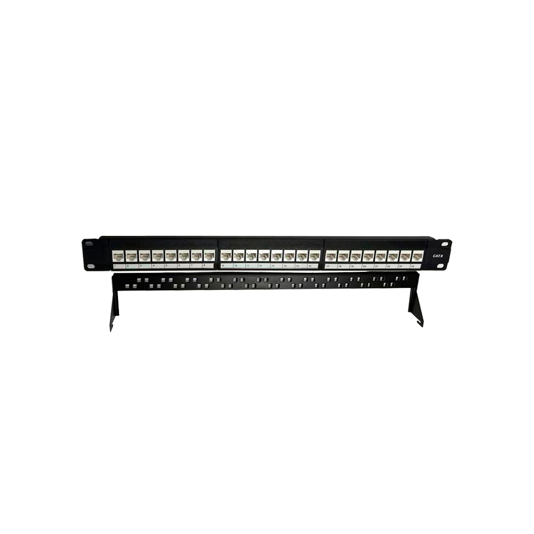 Patch panel para rack de 19" con 24 conectores Cat6 UTP extraíbles, diseñado para la terminación y organización del cableado estructurado en armarios de comunicaciones.