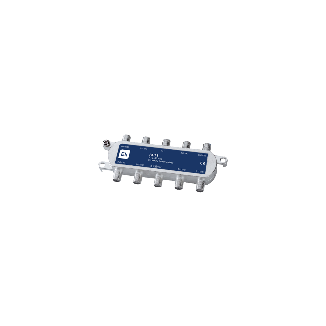 El derivador TV EK PAU 8 es un dispositivo de distribución de señal coaxial diseñado para instalaciones de telecomunicaciones, permitiendo repartir la señal en 8 salidas con conector F. Ofrece un alto rendimiento gracias a su amplio rango de frecuencia y su elevada protección frente a interferencias.