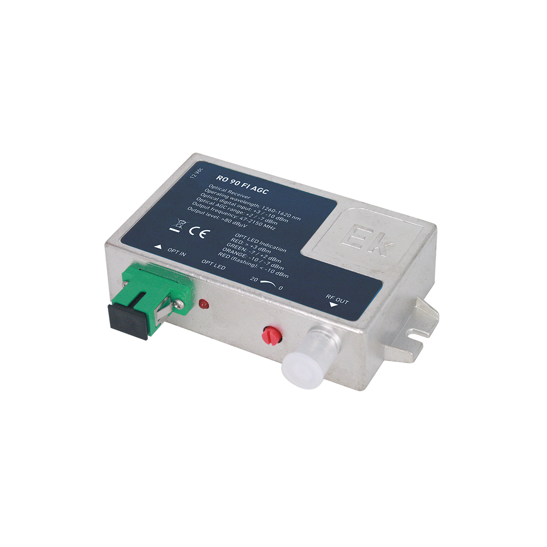 El Receptor óptico EKSelans RO 90 FI AGC permite la recepción de señal óptica y su conversión a radiofrecuencia en banda ampliada hasta 2150 MHz, apto para distribución de TV y FI satélite. Incorpora control automático de ganancia (AGC) para mantener nivel de salida estable.