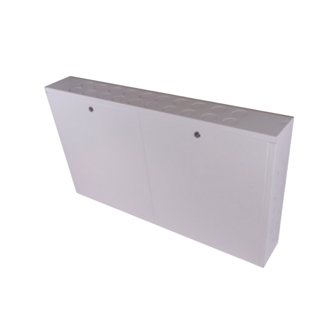 Armario metálico ICT para telecomunicaciones Dimensiones 1000 x 550 x 150 mm Fabricado en chapa laminada en frío con fondo de madera Instalación en superficie con tapa Dos puertas con cerradura y doble llave de seguridad Color blanco RAL 9010 Referencia fabricante: NV050202