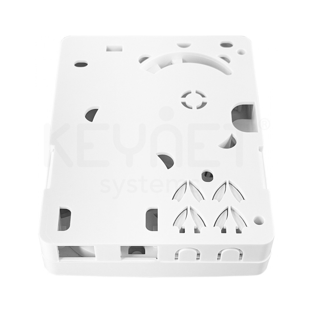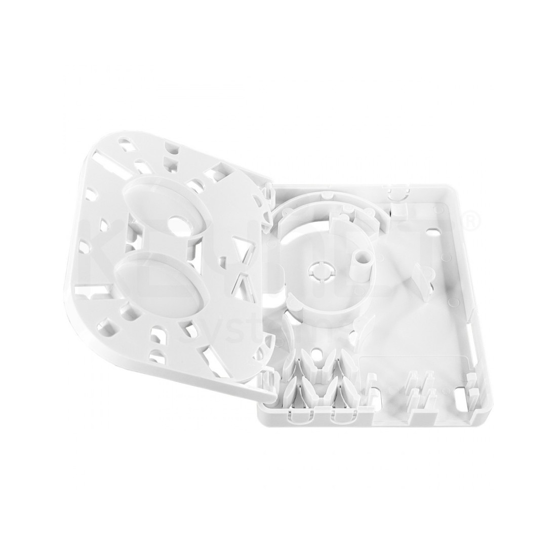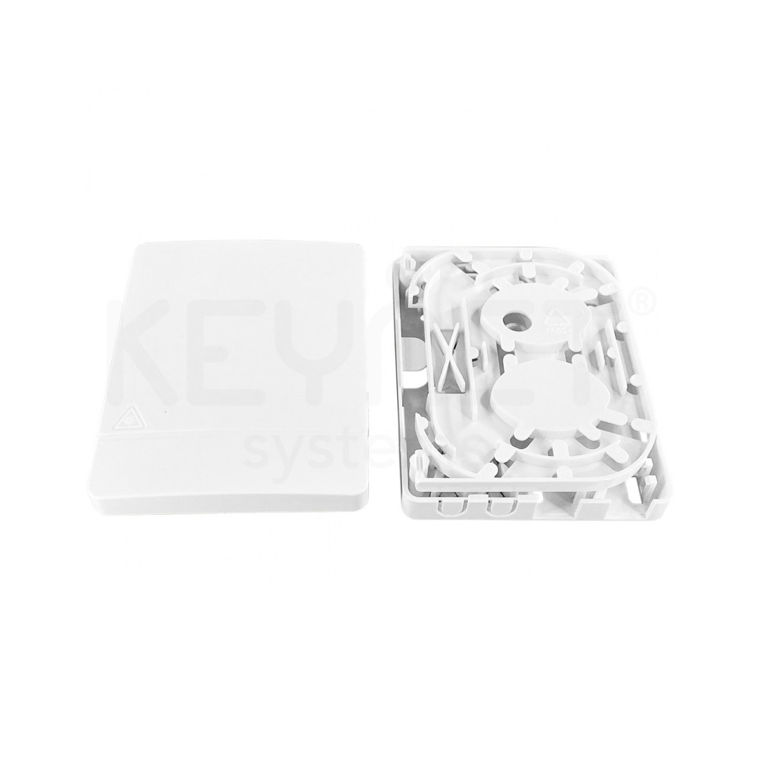 Roseta óptica Keynet FTB-3300 Serie FTB-3300 Fabricada en ABS UL 94V-0, color blanco RAL9003 Entradas 2 inferiores + 1 superior (ø4mm) Salidas 2 zócalos para adaptadores SC/LC (no incluidos) Bandeja con capacidad para 4 protectores de fusión y soporte para 8 empalmes Radio curvatura mínimo 40 mm, tapa removible con cierre presión Grado de protección IP42 (IP52 con adhesivo adicional) Dimensiones 82×105×23 mm, peso 64 g (vacía) Referencia del fabricante: FTB-3300