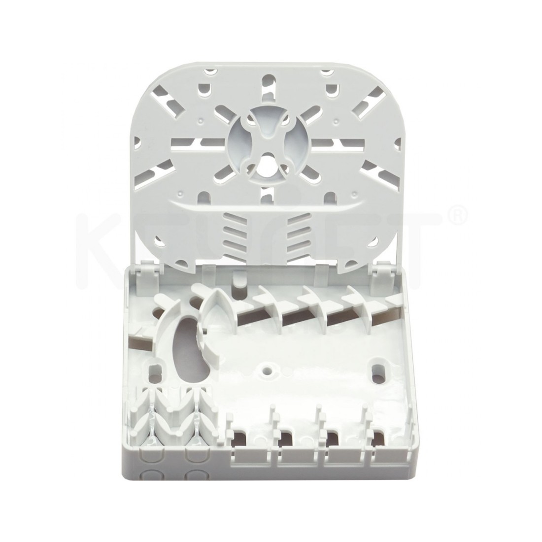 Roseta óptica Keynet FTB-1045-DH Serie FTB-1045 con soporte carril DIN incluido Fabricada en ABS UL94V-0 autoextinguible, color blanco RAL9003 4 adaptadores SC/APC (no incluidos) Bandeja abatible con capacidad para 4 fusiones y 4 protectores termorretráctiles Entradas pretroqueladas 2×ø4 mm por cada lado, fijación pared/bridas Radio curvatura mínimo 20 mm Protección IP44, tapa desmontable con cierre presión Dimensiones 100×80×30 mm, peso 33 g Referencia fabricante: FTB-1045-DH