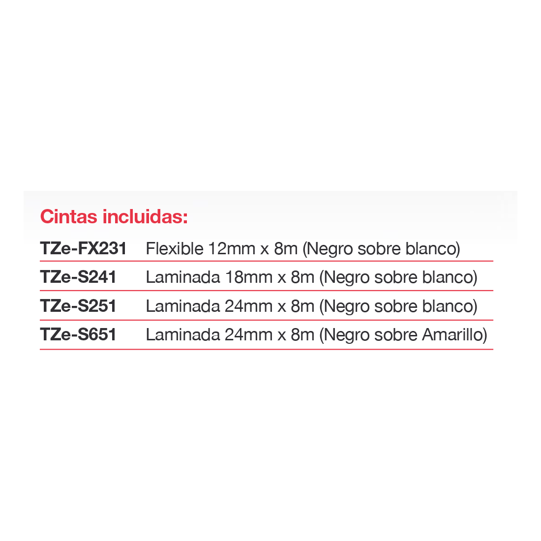 1 cinta ID Flexible Negro sobre blanco 12mm x 8m 1 cinta Super Adhesiva Negro sobre blanco 18mm x 8m 1 cinta Super Adhesiva Negro sobre blanco 24mm x 8m 1 cinta Super Adhesiva Negro sobre amarillo 24mm x 8m |