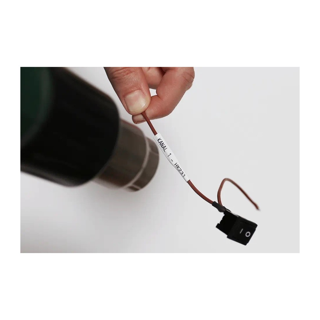 Cinta para tubo termoretráctil para cables de 1.6 a 5.4mm. Texto negro sobre fondo Blanco. 9mm (1.5mts de largo).