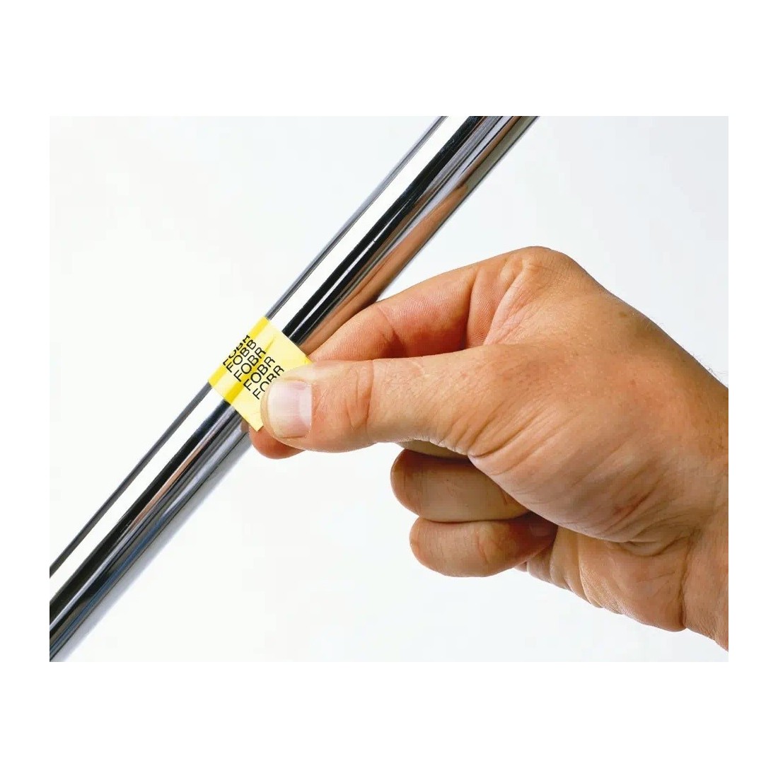 Cinta laminada flexible. Texto negro sobre fondo amarillo. Ancho: 18 mm. Longitud: 8 m