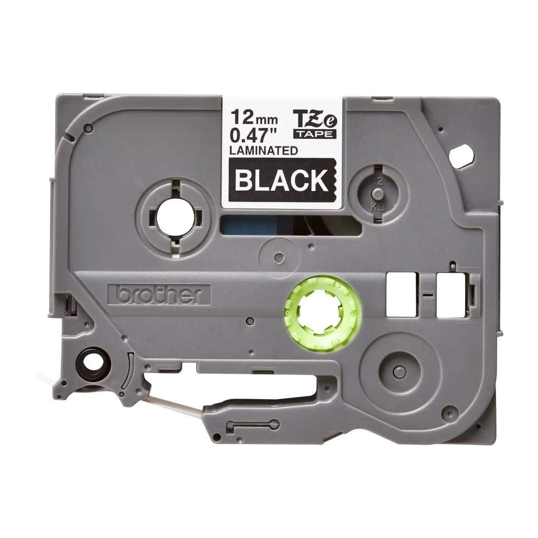 Cinta laminada flexible. Texto blanco sobre fondo negro. Ancho: 12 mm. Longitud: 8 m